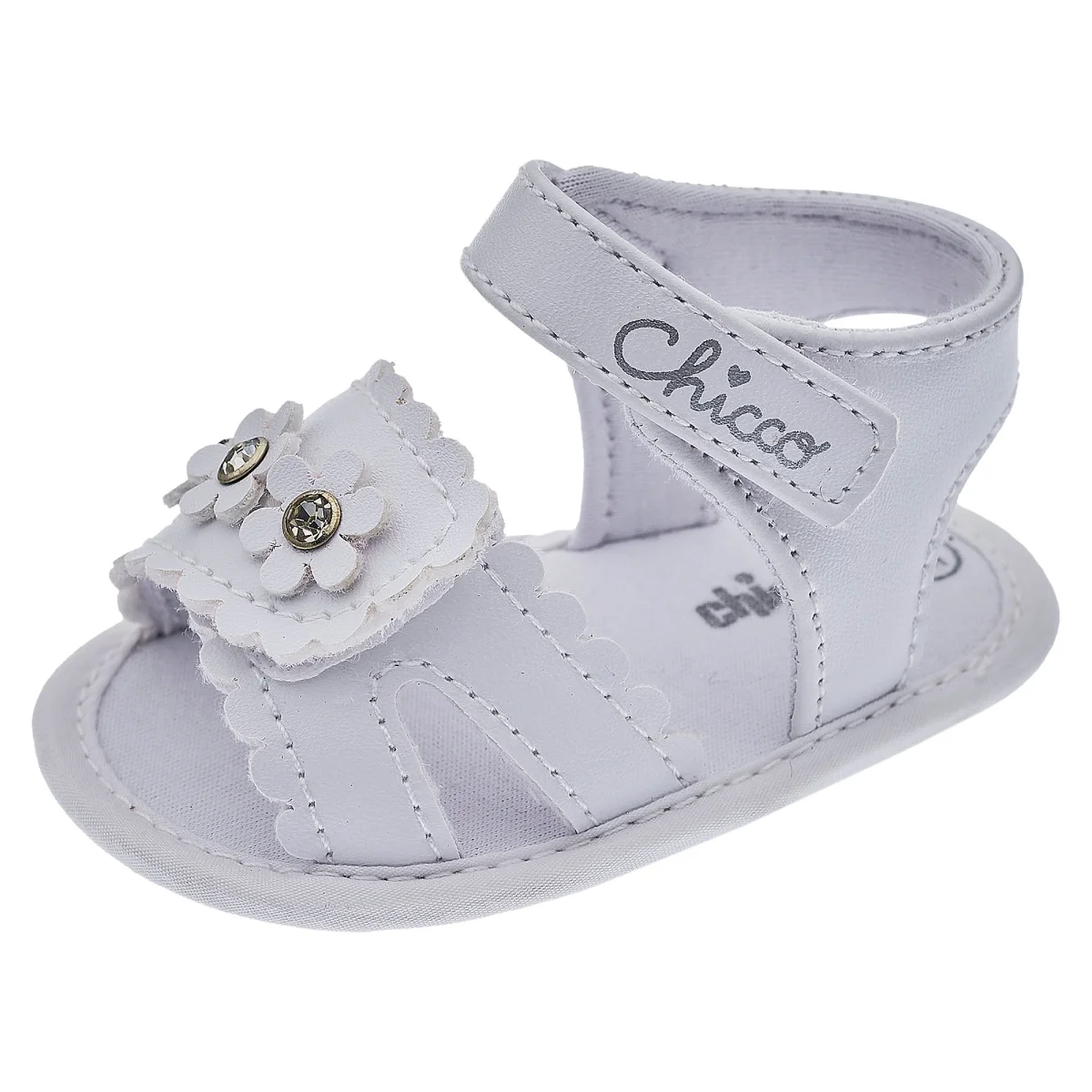 Sandalo CHICCO linea da culla, in ecopelle con fiori e strass applicati, chiusura con velcro, logo stampato applicato.