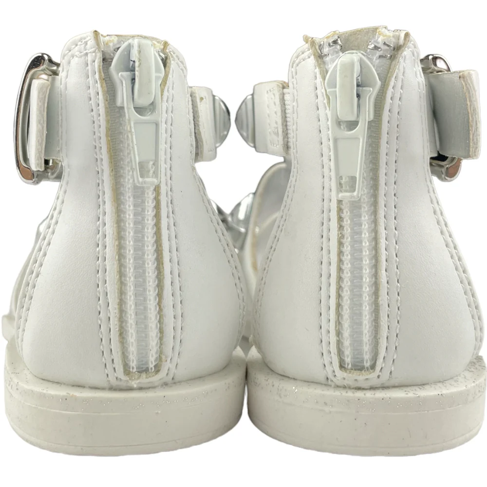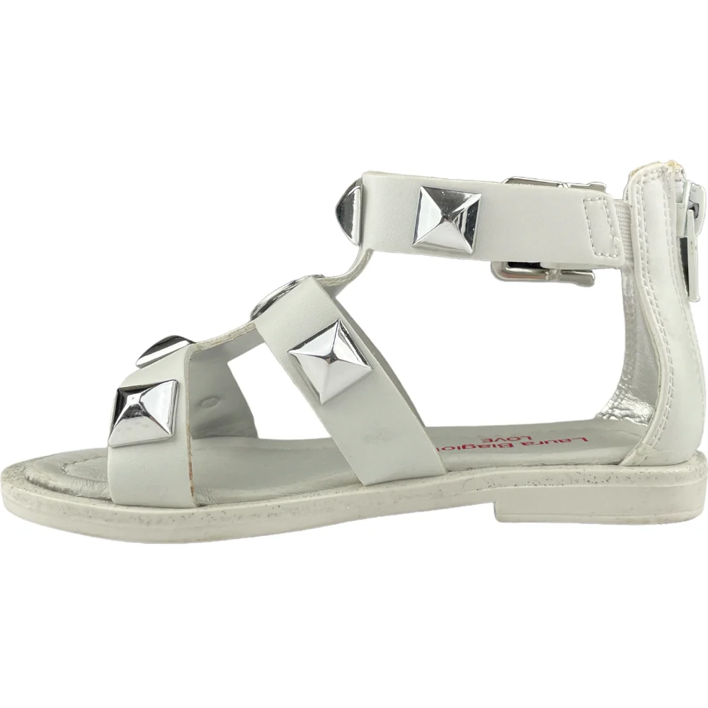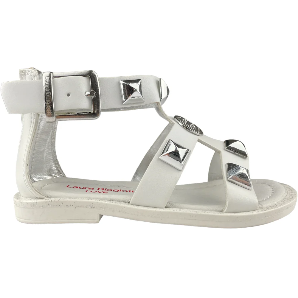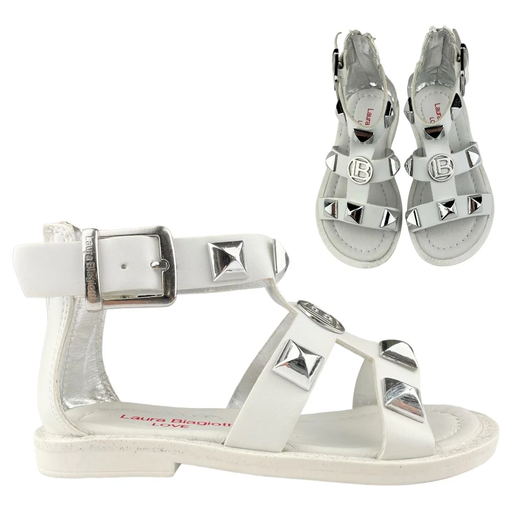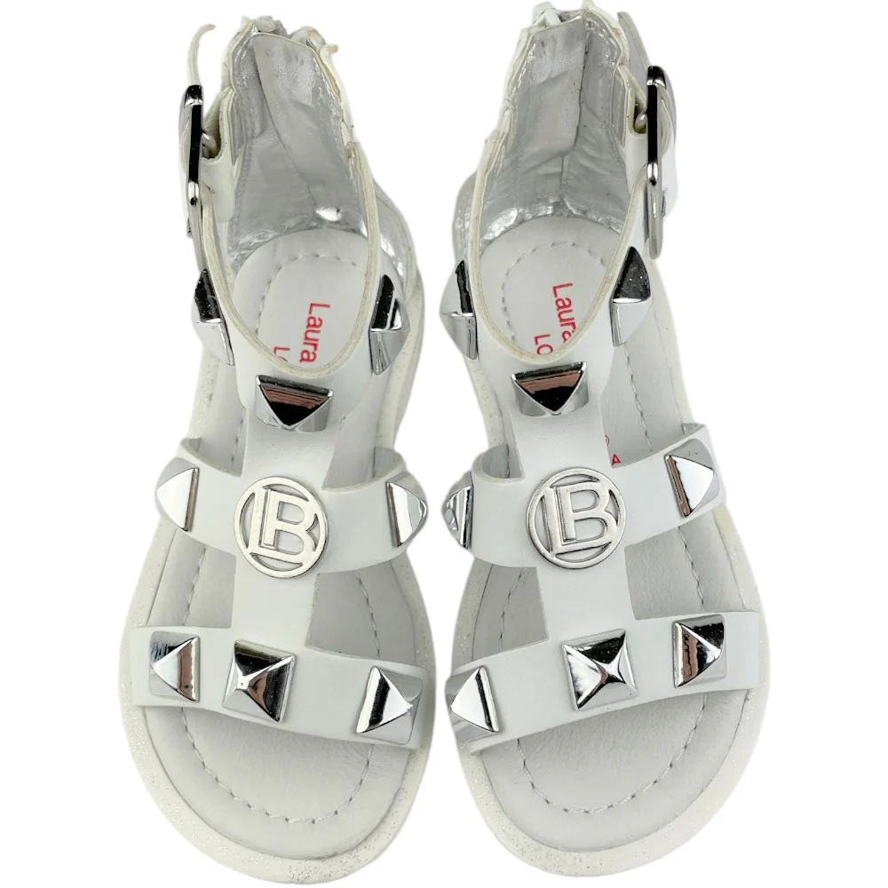 Sandalo LAURA BIAGIOTTI bianco con borchie applicate e logo laura biagiotti in metallo. chiusura con zip sul retro. sittopiede in vera pelle. fondo in gomma antiscivolo.