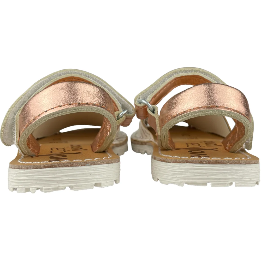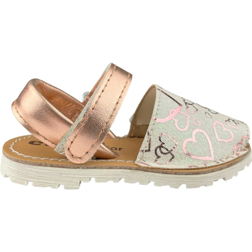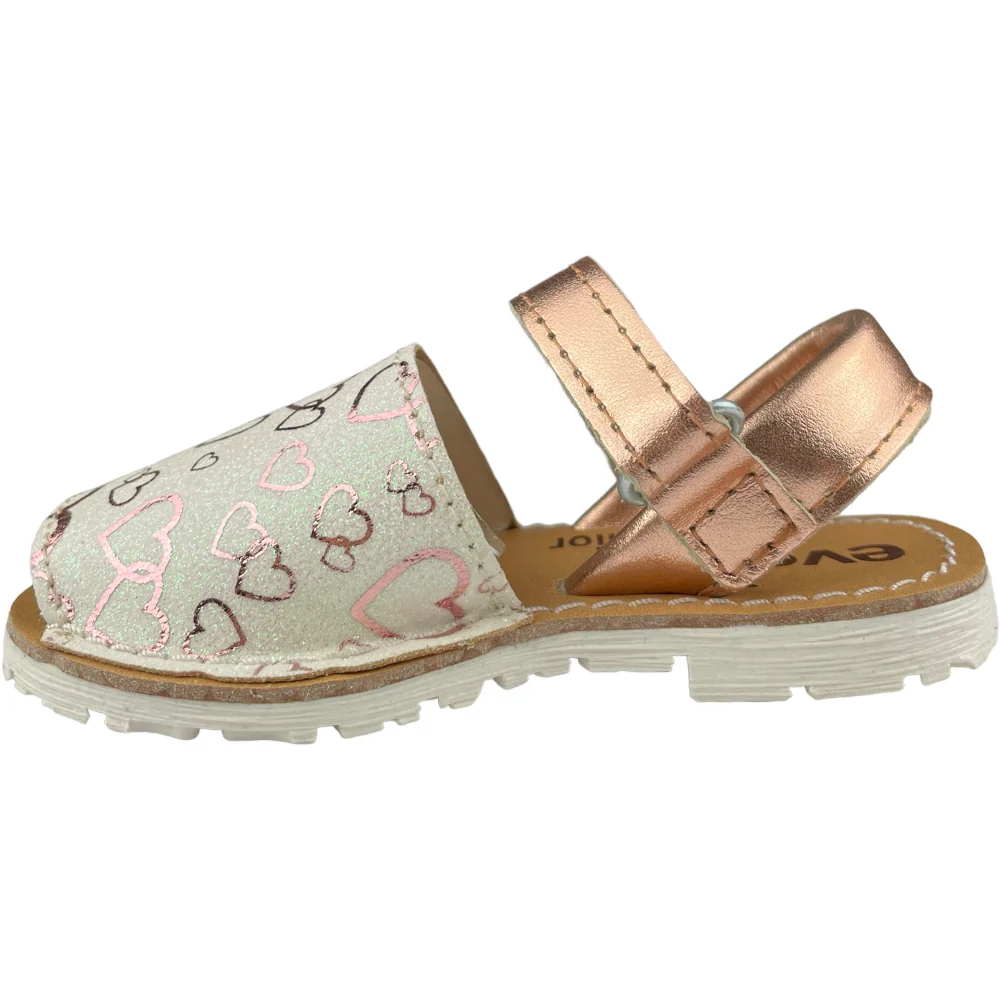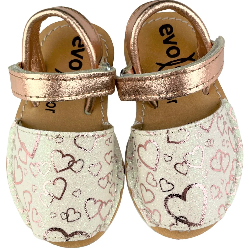 Sandalo minorchina EVOCA con parte anteriore in glitter con cuori a contrasto chiusura con cinturino regolabile. sottopiede in vera pelle. fondo flessibile in gomma antiscivolo.