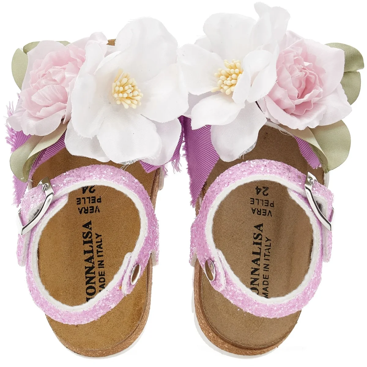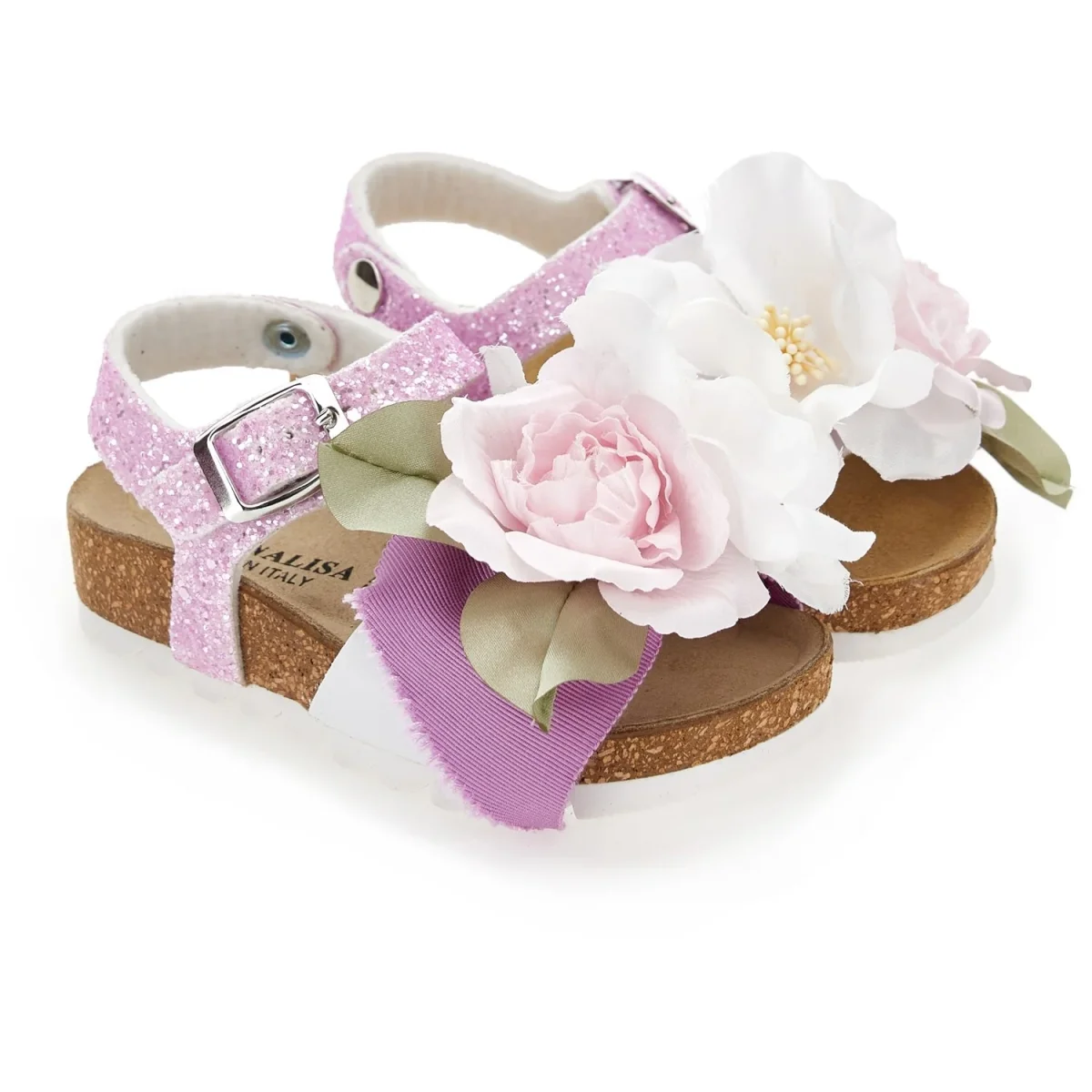 Sandalo MONNALISA con chiusura fibbia regolabile inserti glitter applicazioni floreali sottopiede in vera pelle fondo in gomma.Made in Italy