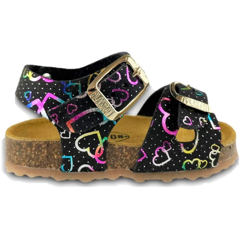 Sandalo PLAKTON in ecopelle stampa cuori multicolorfibbie regolabilisottopiede anatomico in Vera Pelle, fondo flessibile in sughero naturale,suola in gomma antiscivolo.Prodotto con materiali.