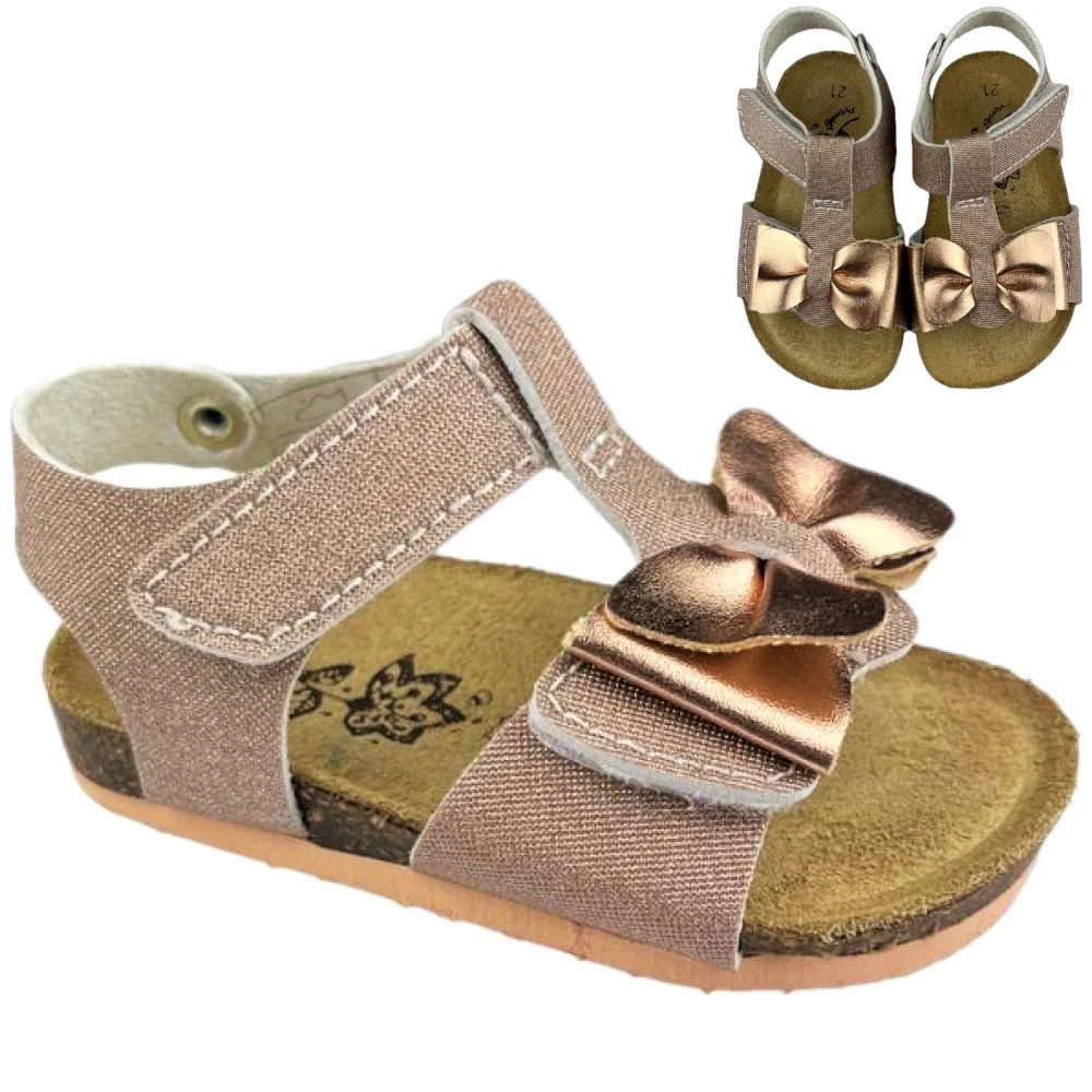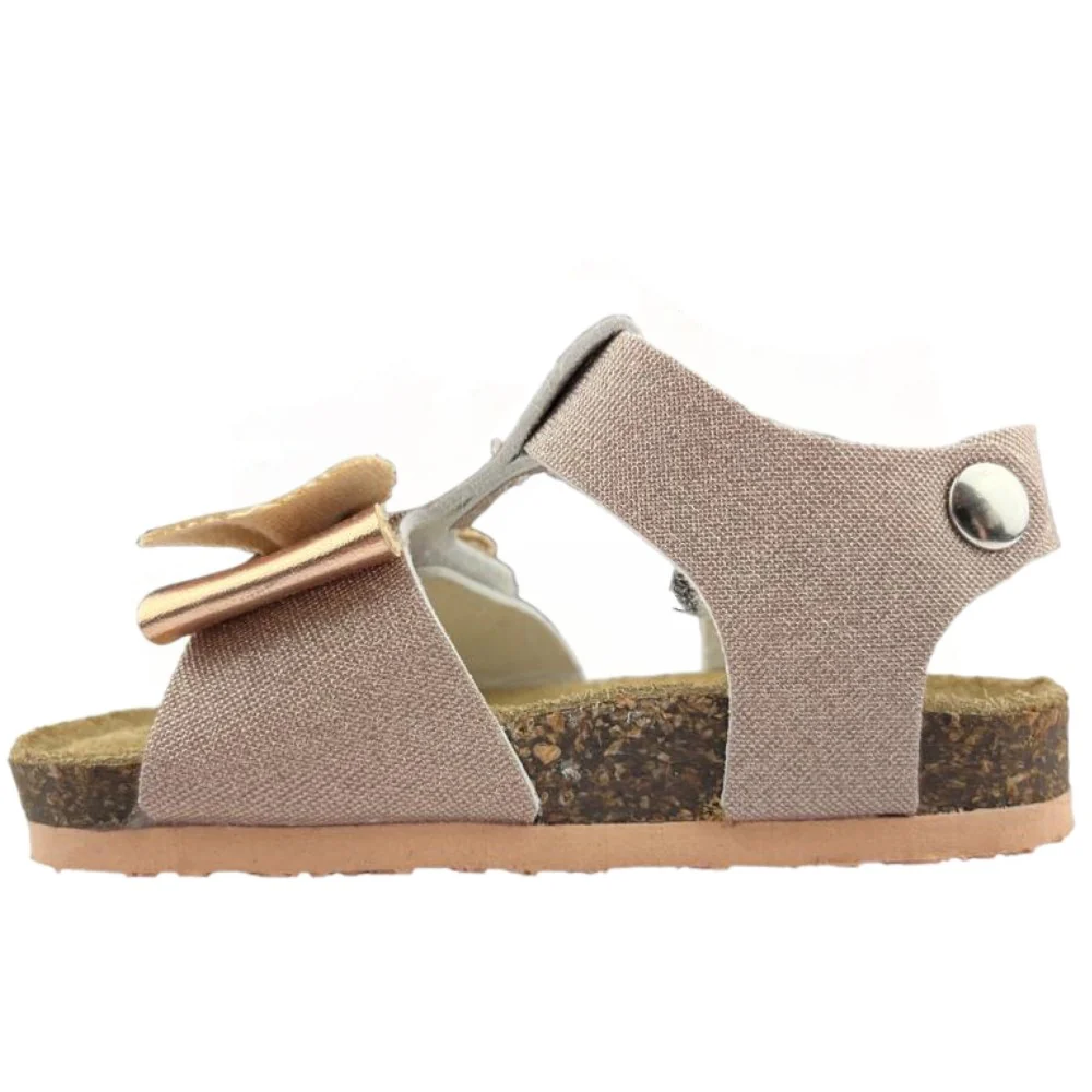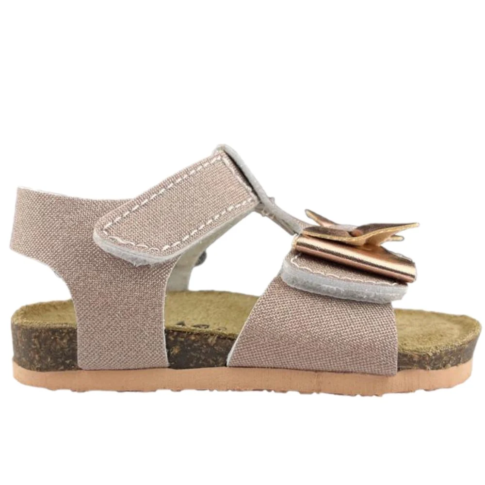 Sandalo PRIMIGI in tessuto laminato con doppia chiusura velcro sottopiede anatomico in vera pelle fiocco applicato fondo in gomma logata.