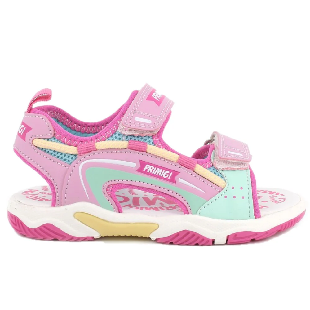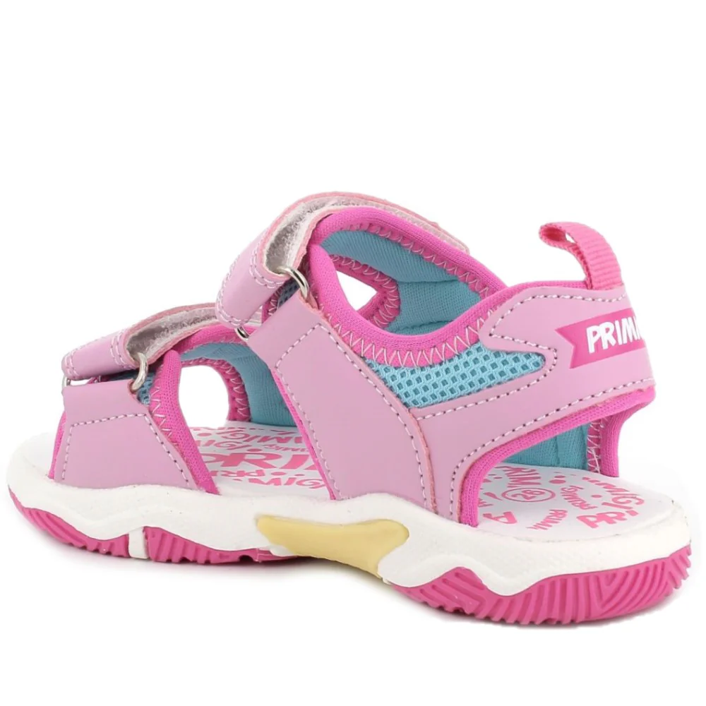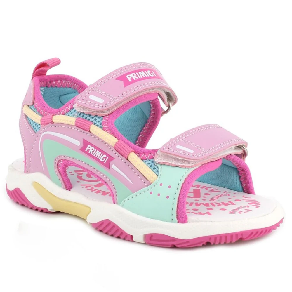 Sandalo PRIMIGI in tessuto con chiusura doppio velcro sottopiede a fantasia logata fondo flessibile in gomma antiscivolo.