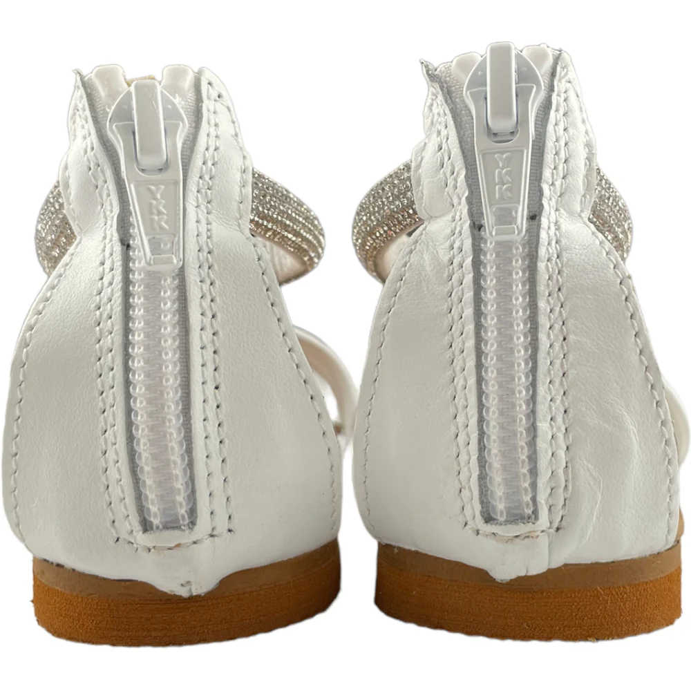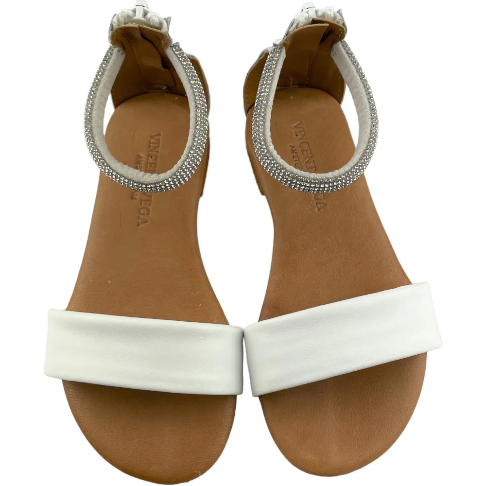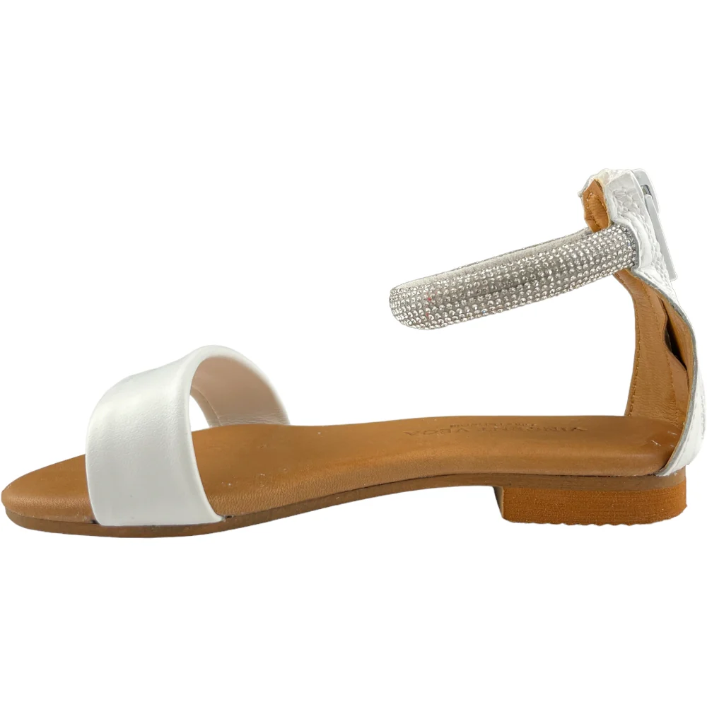 Sandalo VINCENT VEGA in pelle bianco con fascia alla caviglia in strass apertura suol retro con zip. sottopiede in vera pelle. fondo in vero cuoi ecologico antiscivolo.MADE IN ITALY