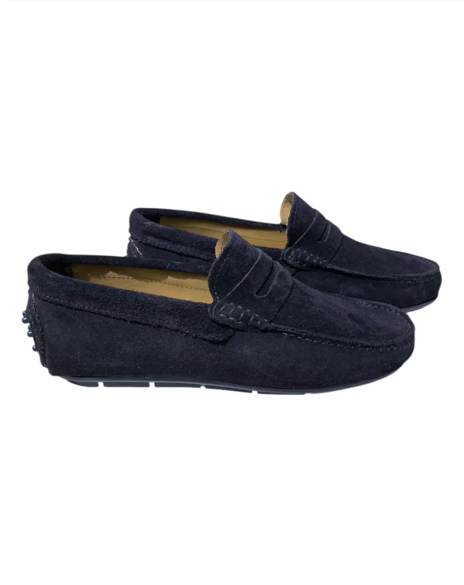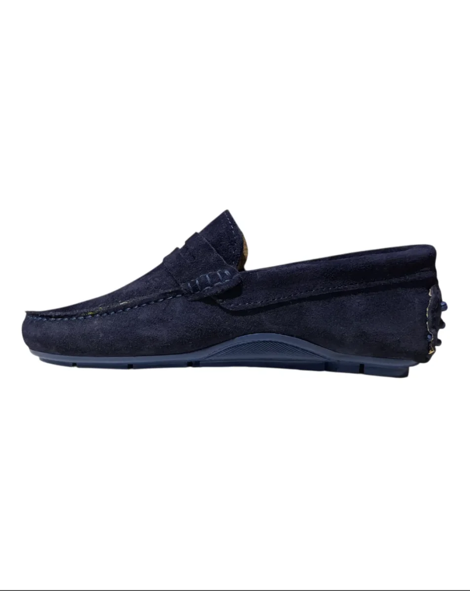 Mocassino uomo classico in morbida pelle scamosciata. Suola in gomma, gommini applicati sul tallone. Calzata regolare.