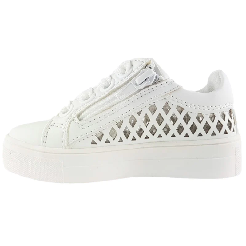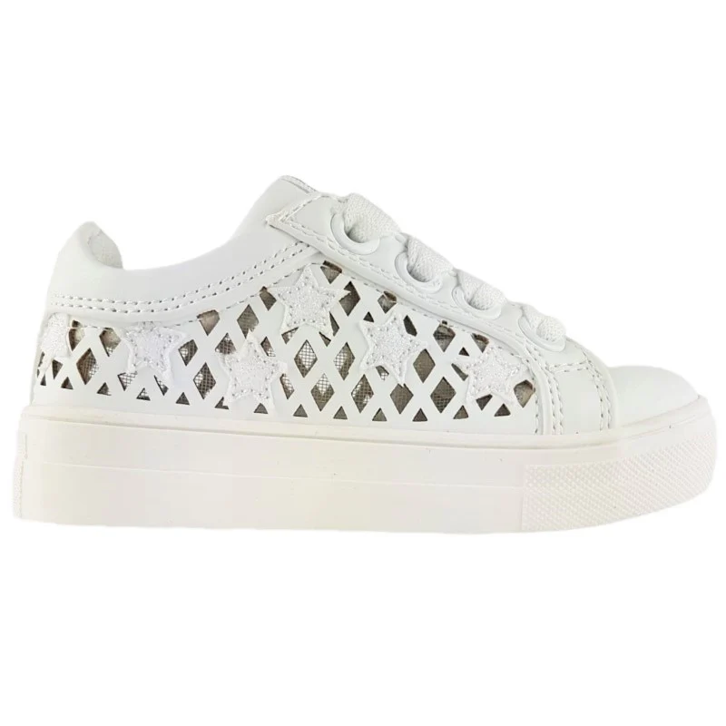 Scarpa ASSO in ecopellelateralmente traforatacon applicazioni di stelline in glitterchiusura con lacci + zip lateralesottopiede in Vera Pellefondo in gommaleggermente zeppatoantiscivolo.