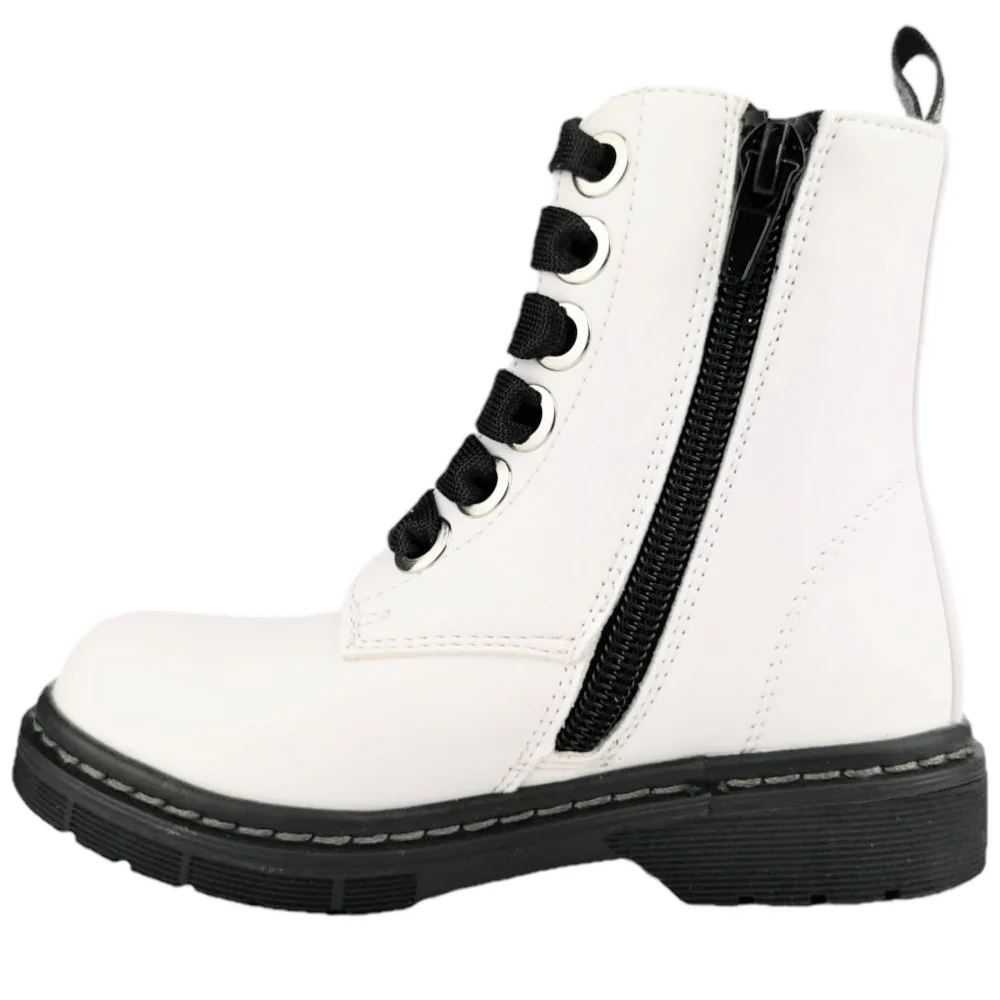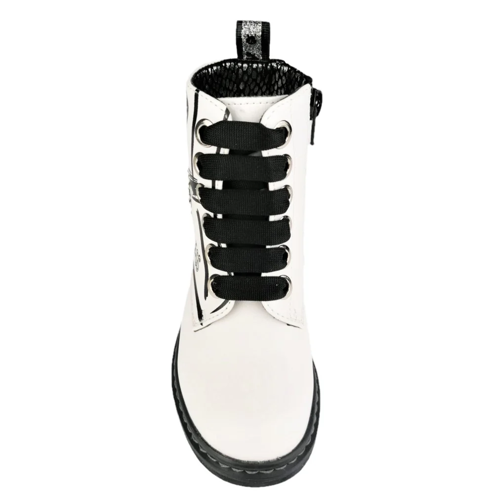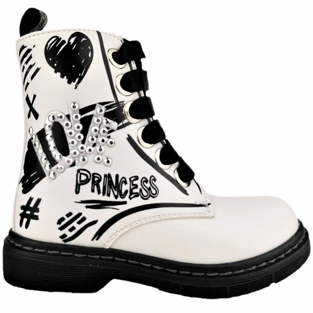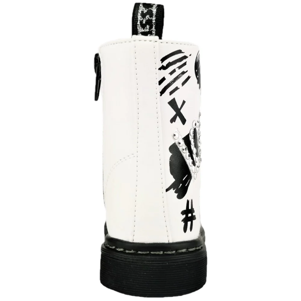 Scarpa ASSO modello anfibio in ecopelle con stampa e borchiette applicate chiusura laccio e zip laterale fondo in gomma antiscivolo.