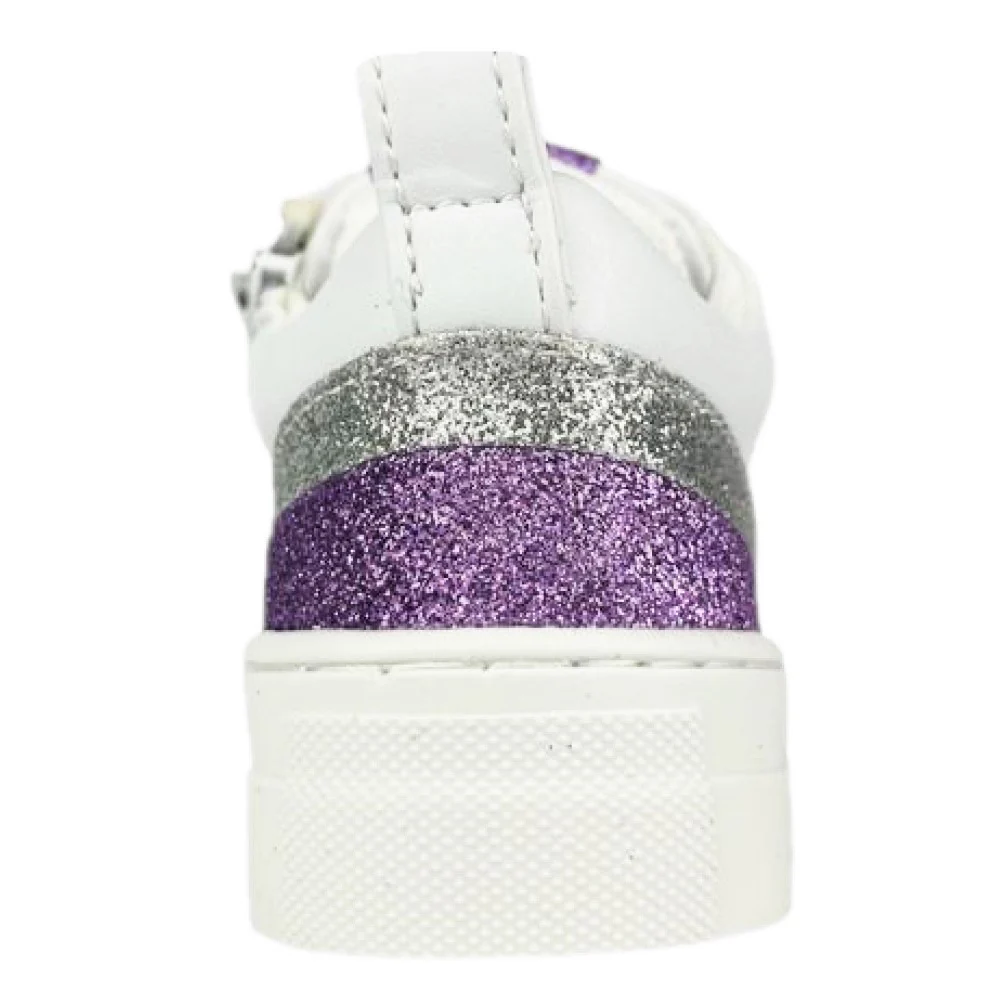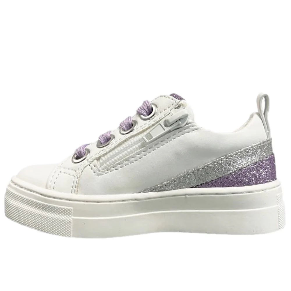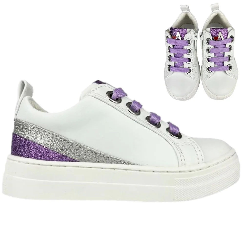 Scarpa ASSO modello sneakers con chiusura lacci e zip laterale inserti glitter e logo a rilievo fondo in gomma antiscivolo.