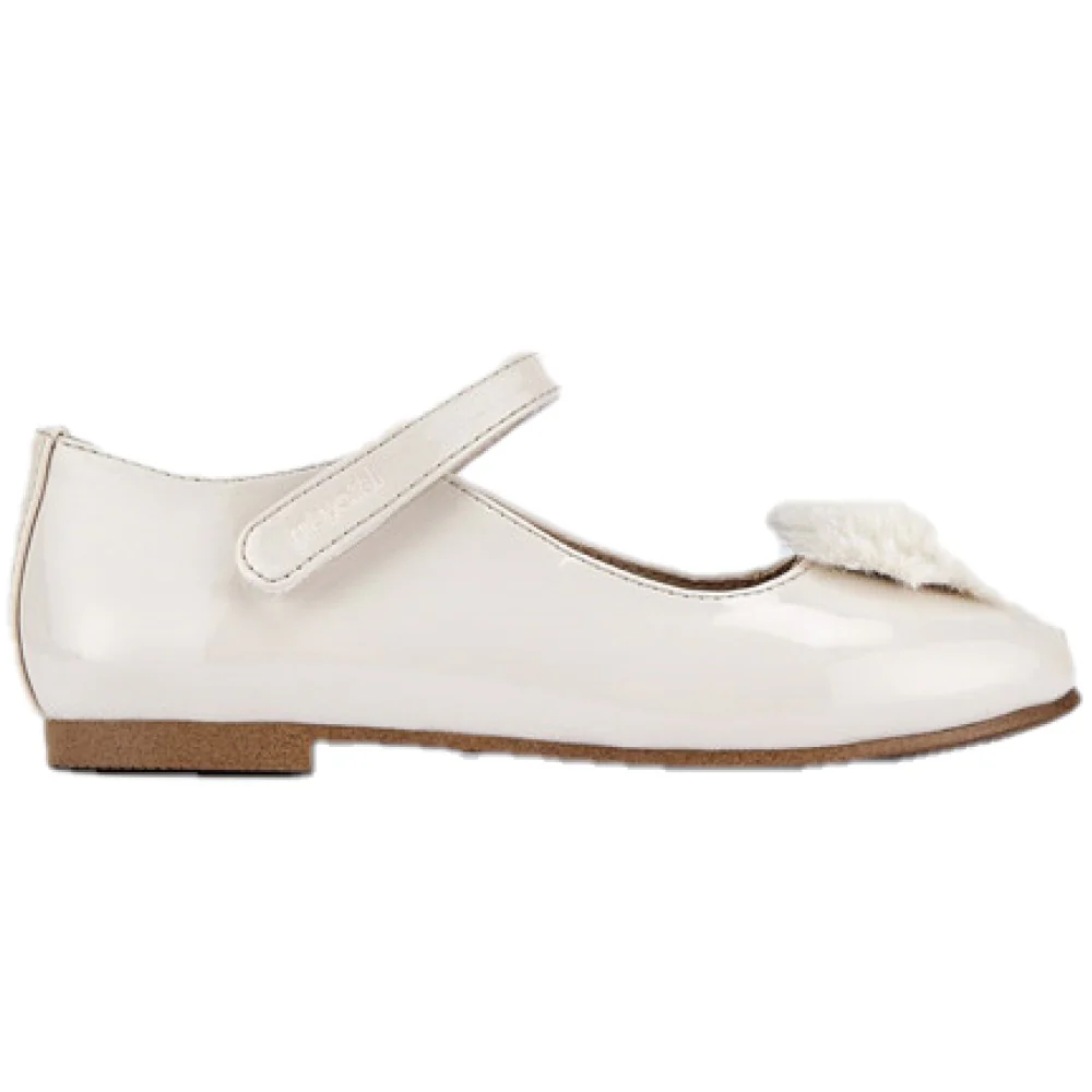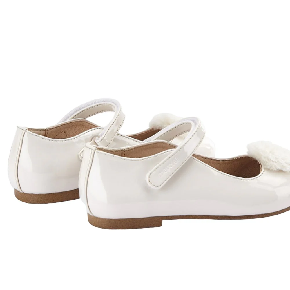 Scarpa MAYORAL modello ballerina in vernice con chiusura velcro logata pompon in ecopelliccia applicato alla punta fodera e sottopiede in vera pelle fondo in gomma.