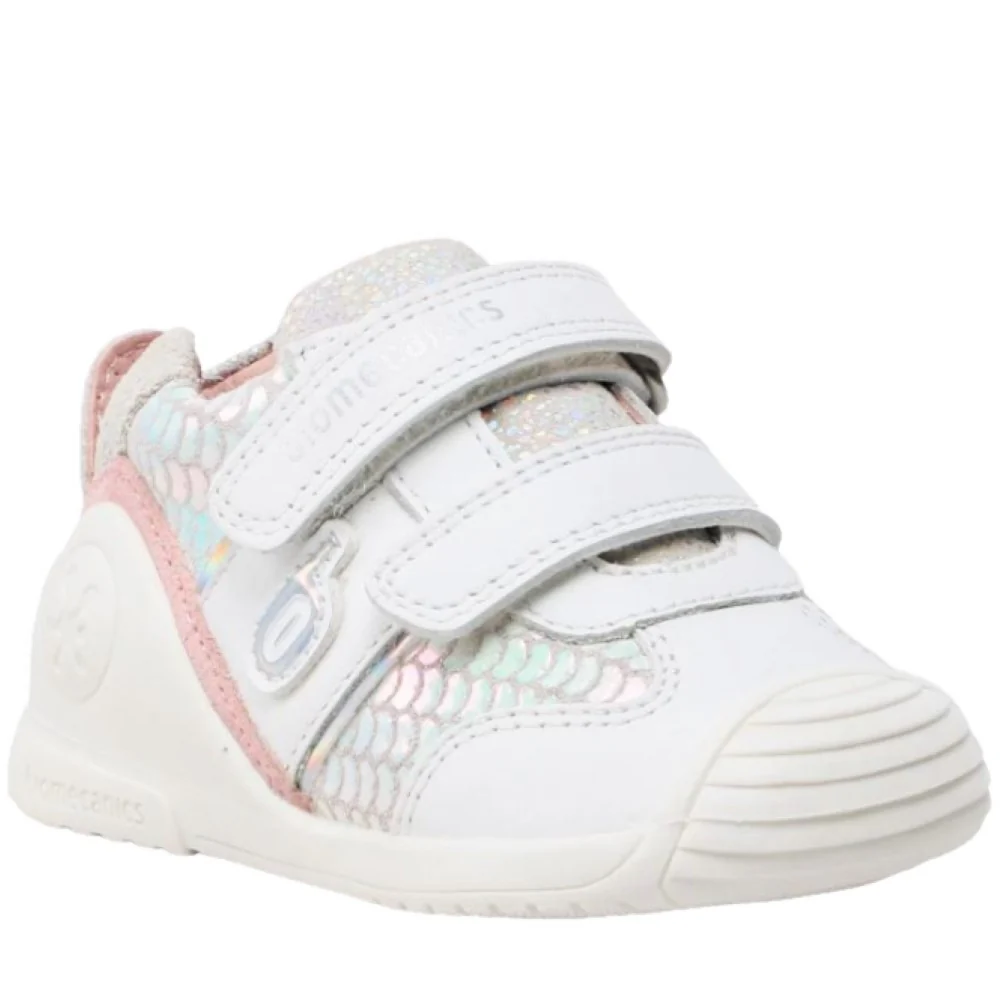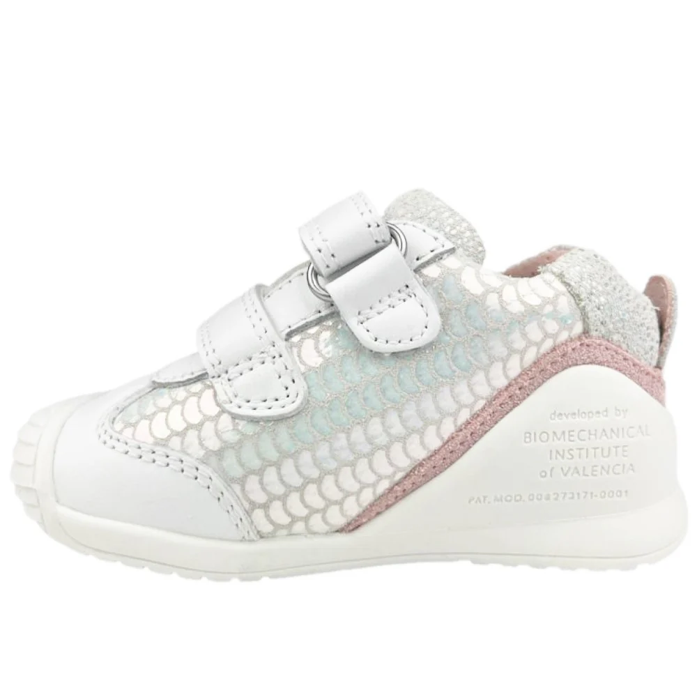 Scarpa BIOMECANICS in pelle e tessuto a fantasia sottopiede anatomico chiusura con doppio velcro regolabile fondo in gomma antiscivolo con stabilizzatori.Stabilizzatori laterali senza contraffortiche permettono lo sviluppo naturale della muscolatura e favoriscono il controllo del movimento.Suola biomeccanica con base della suola più ampia per garantire maggior equilibrio e stabilità.Suola super flessibile e punta rinforzata per procedere più facilmente e con maggior sicurezza.BIOMECANICS lavora in collaborazione con l’ente PEDIATRIA.MADE IN SPAIN