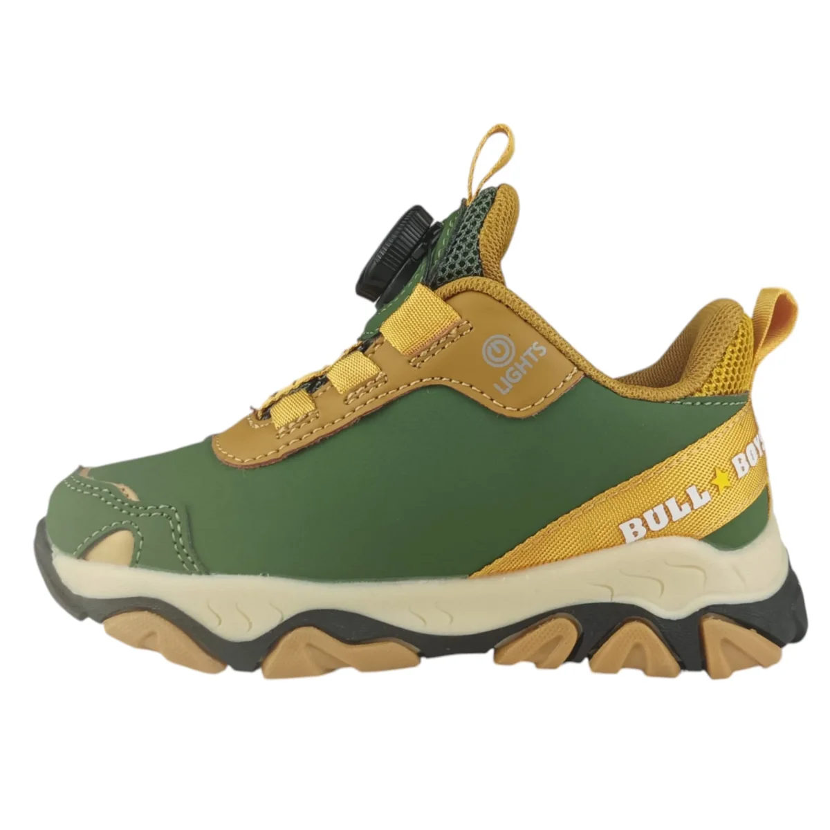 Scarpe BULL BOYS t-rex con luci che si attivano a contatto con il suolo, impronta sul fondo, chiusura con sistema smart fitting mediante rotazione in senso orario della rotellina.