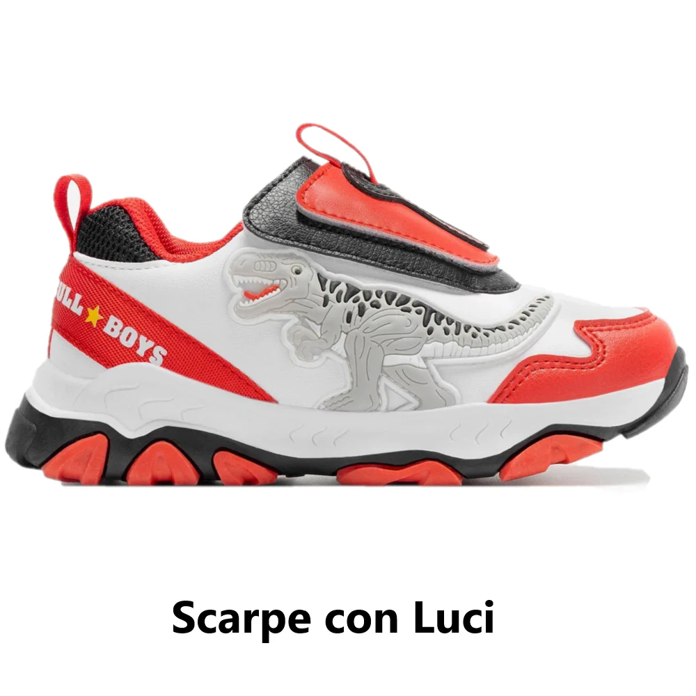 Scarpe BULL BOYS t-rex con luci che si attivano a contatto con il suolo, impronta sul fondo, linguette intercambiabili con velcro.