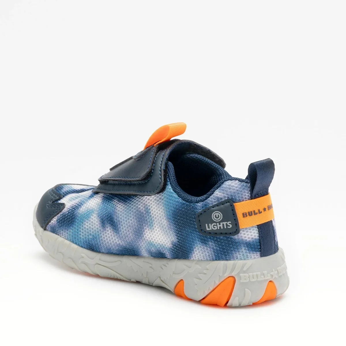 Scarpe BULL BOYS triceratopo con luci che si attivano a contatto con il suolo, impronta sul fondo, linguette intercambiabili con velcro.