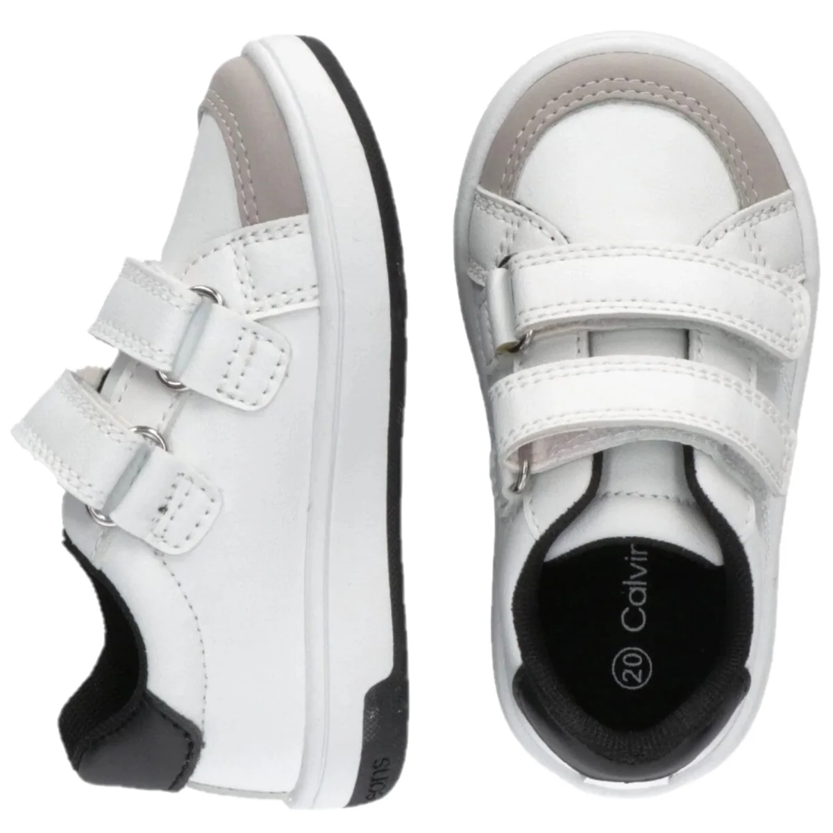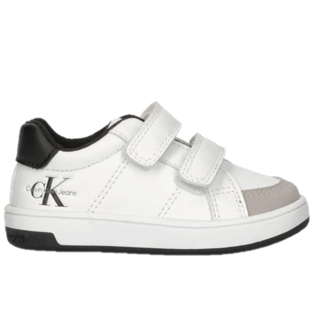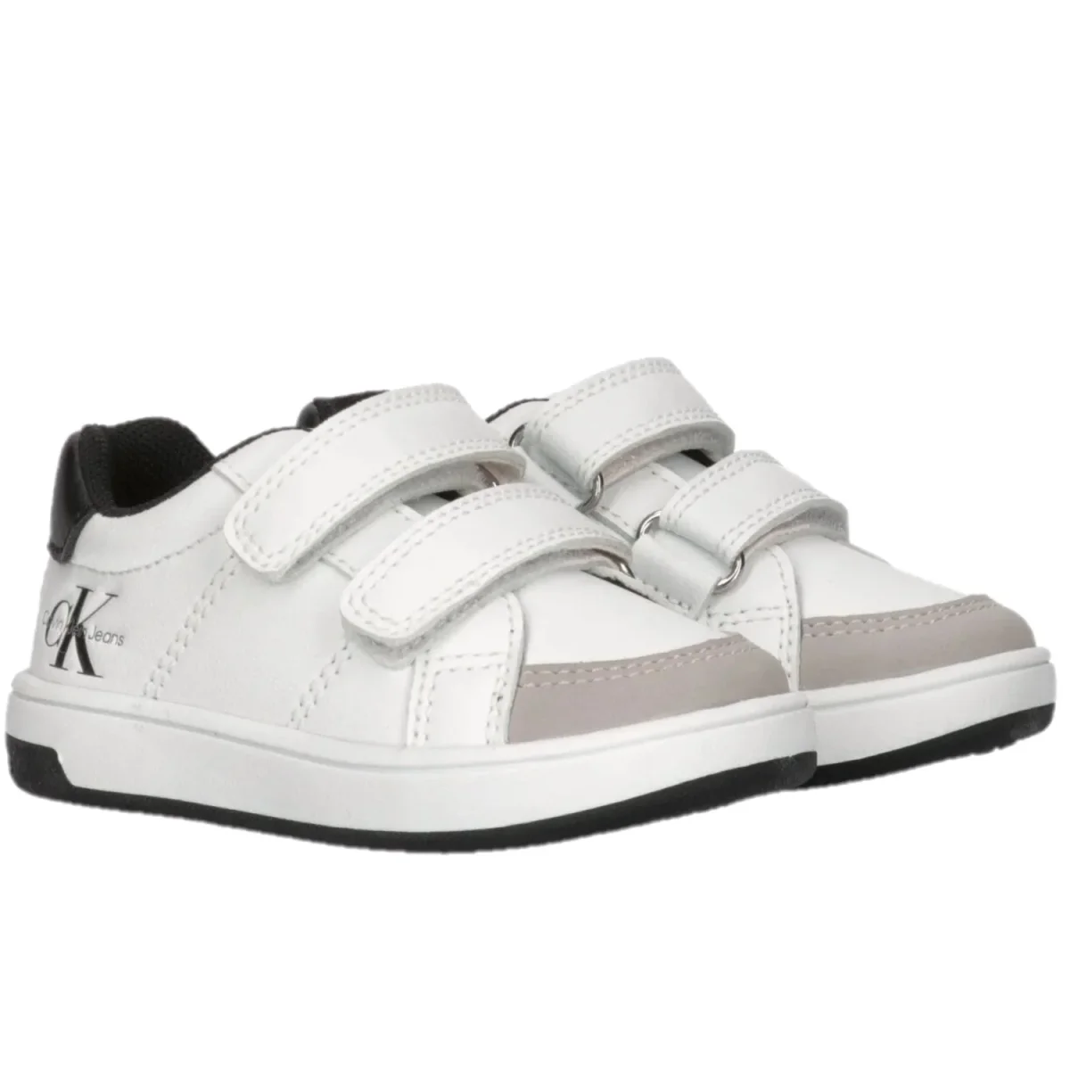 Scarpa CALVIN KLEIN in ecopelle con chiusura doppio velcro , fondo leggero in gomma antiscivolo .