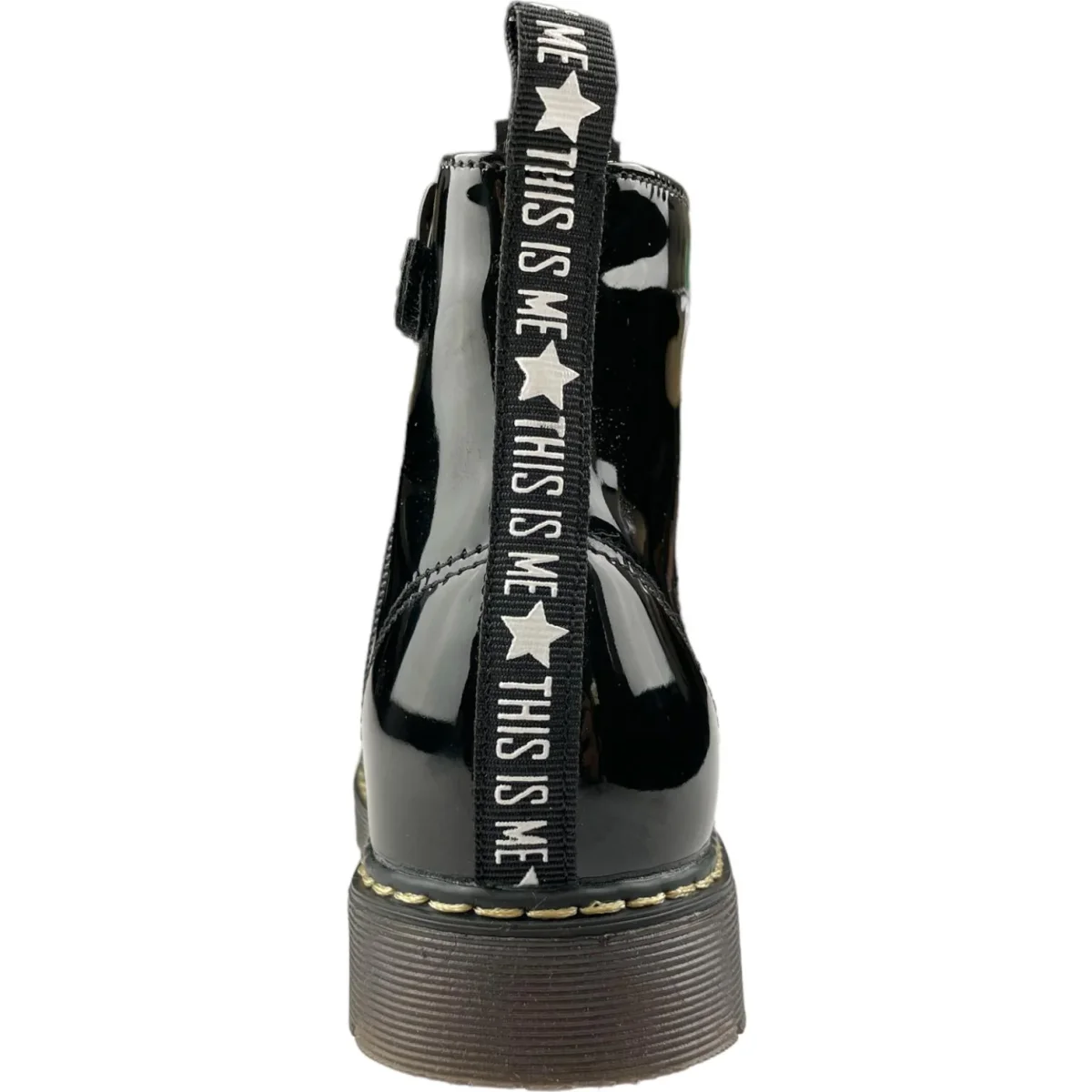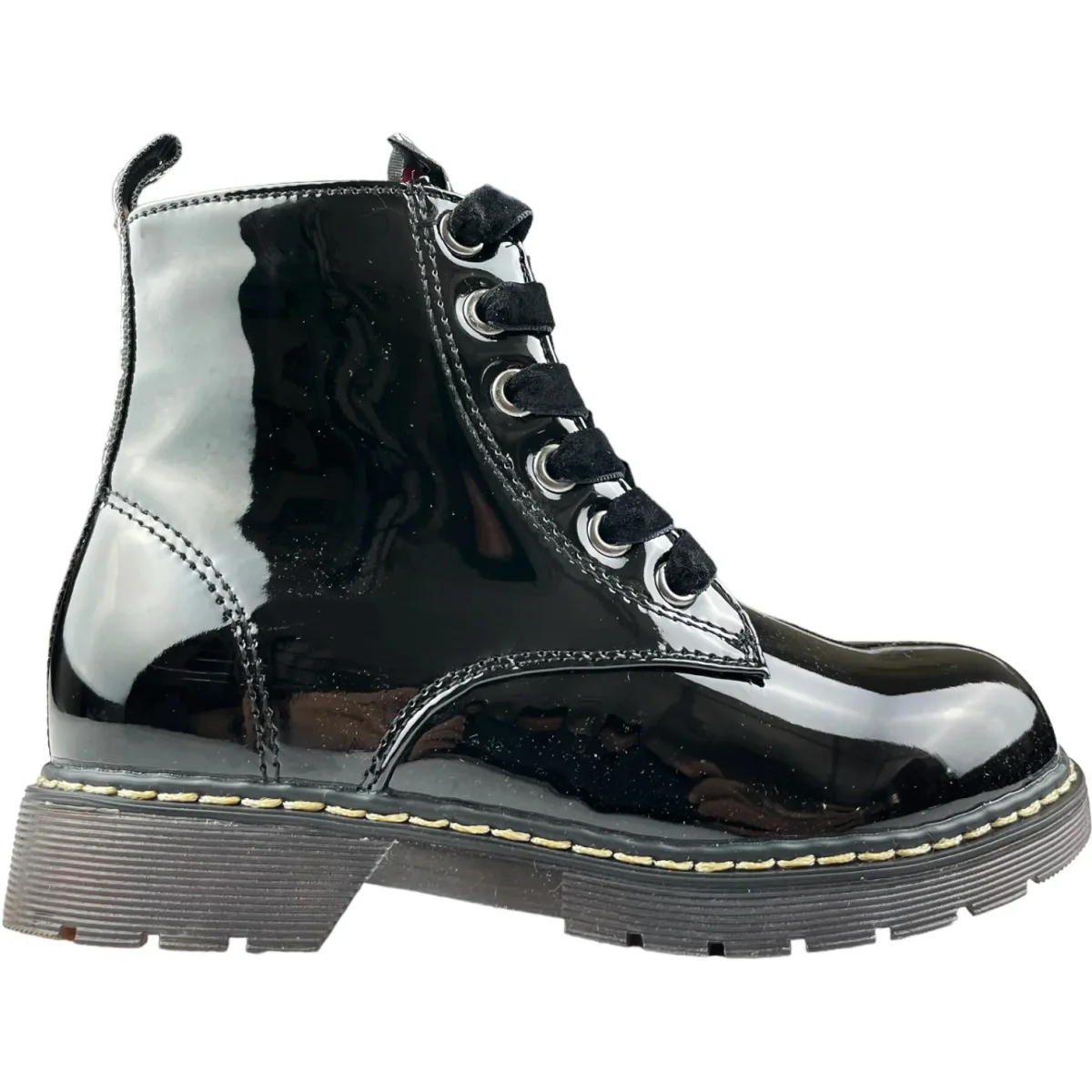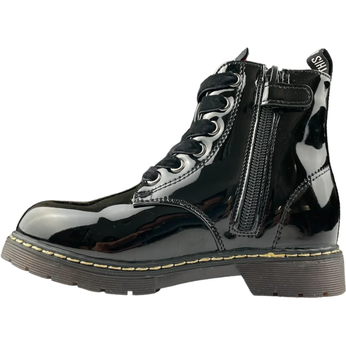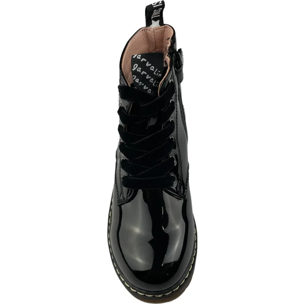 Scarpe GARVALIN modello anfibio in vernice nero lacci in tessuto a contrasto e comoda zip laterale per facilitare la calzata. fondo in gomma antiscivolo.