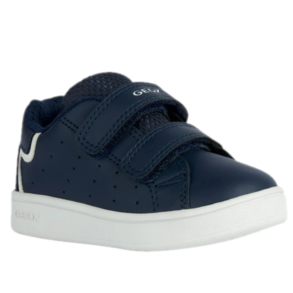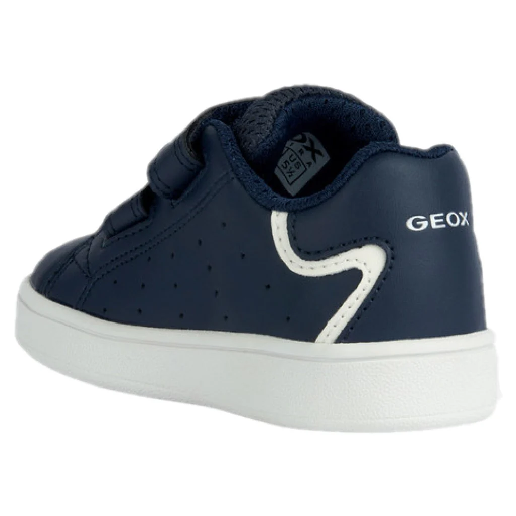 Scarpa GEOX in ecopelle con chiusura doppio velcro per una calzata pratica e confortevole, logo stampato sul retro , fondo leggero in gomma traspirante.
