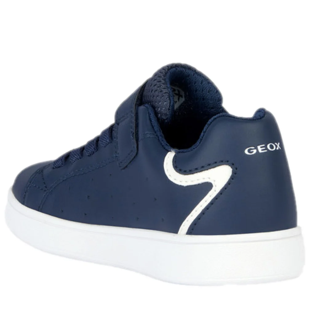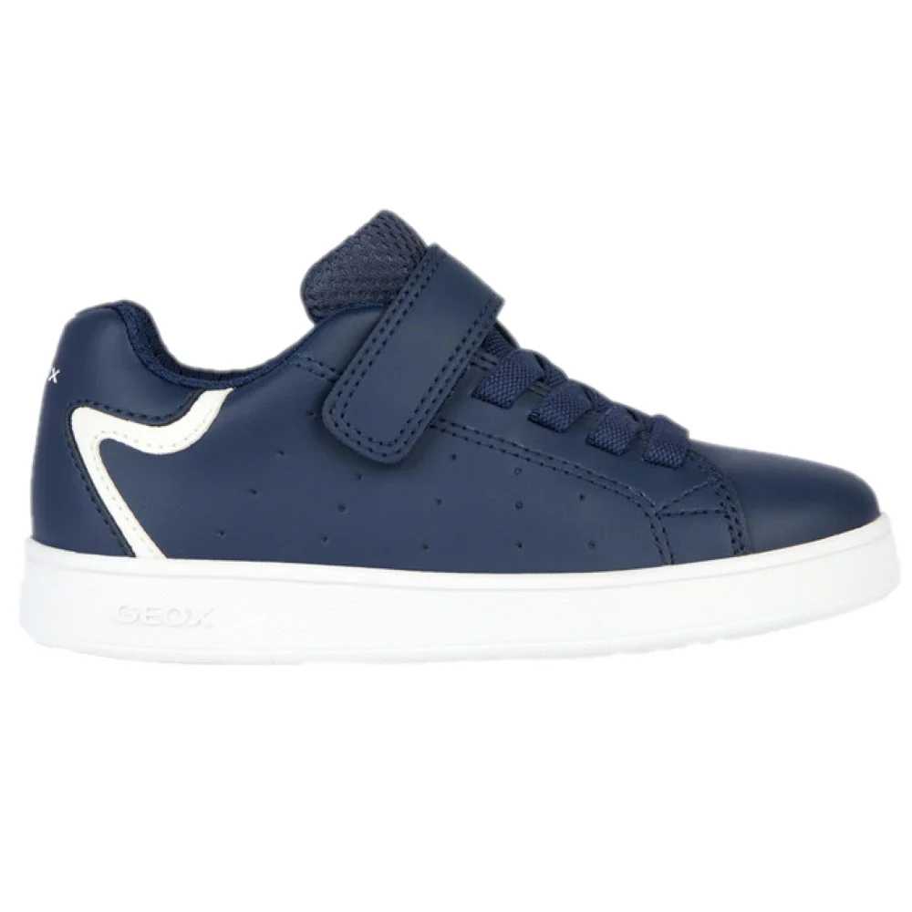 Scarpa GEOX in ecopelle con chiusura velcro e laccio elastico per una calzata pratica e confortevole logo stampato sul retro fondo leggero in gomma traspirante.
