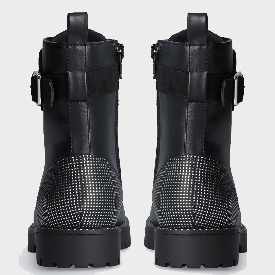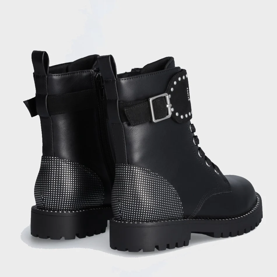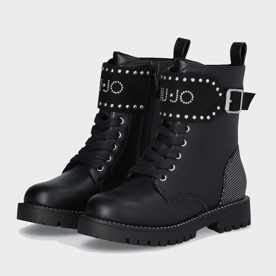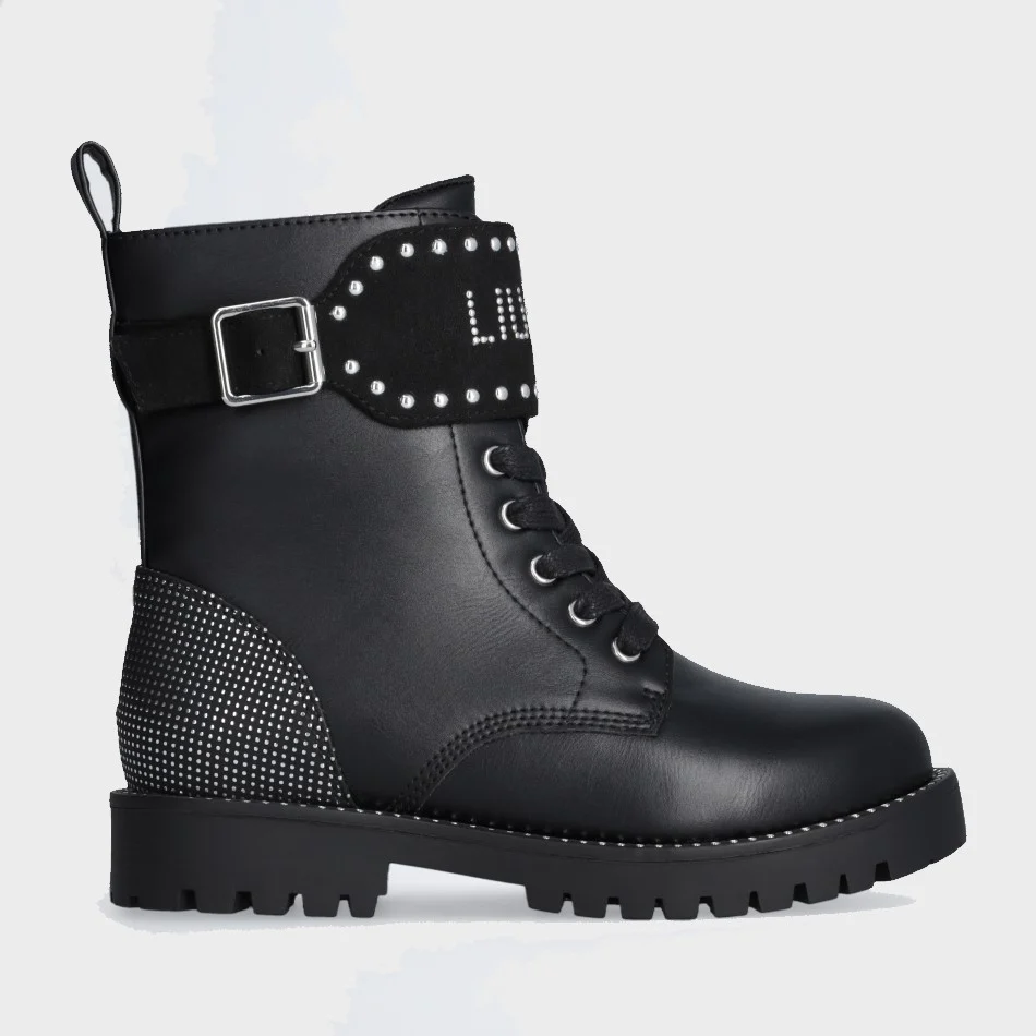 Scarpa LIU JO modello anfibio in ecopelle con chiusura lacci e zip laterale ,fibbia decorativa con logo applicato in borchiette ,fondo in gomma antiscivolo.