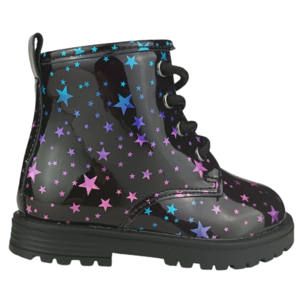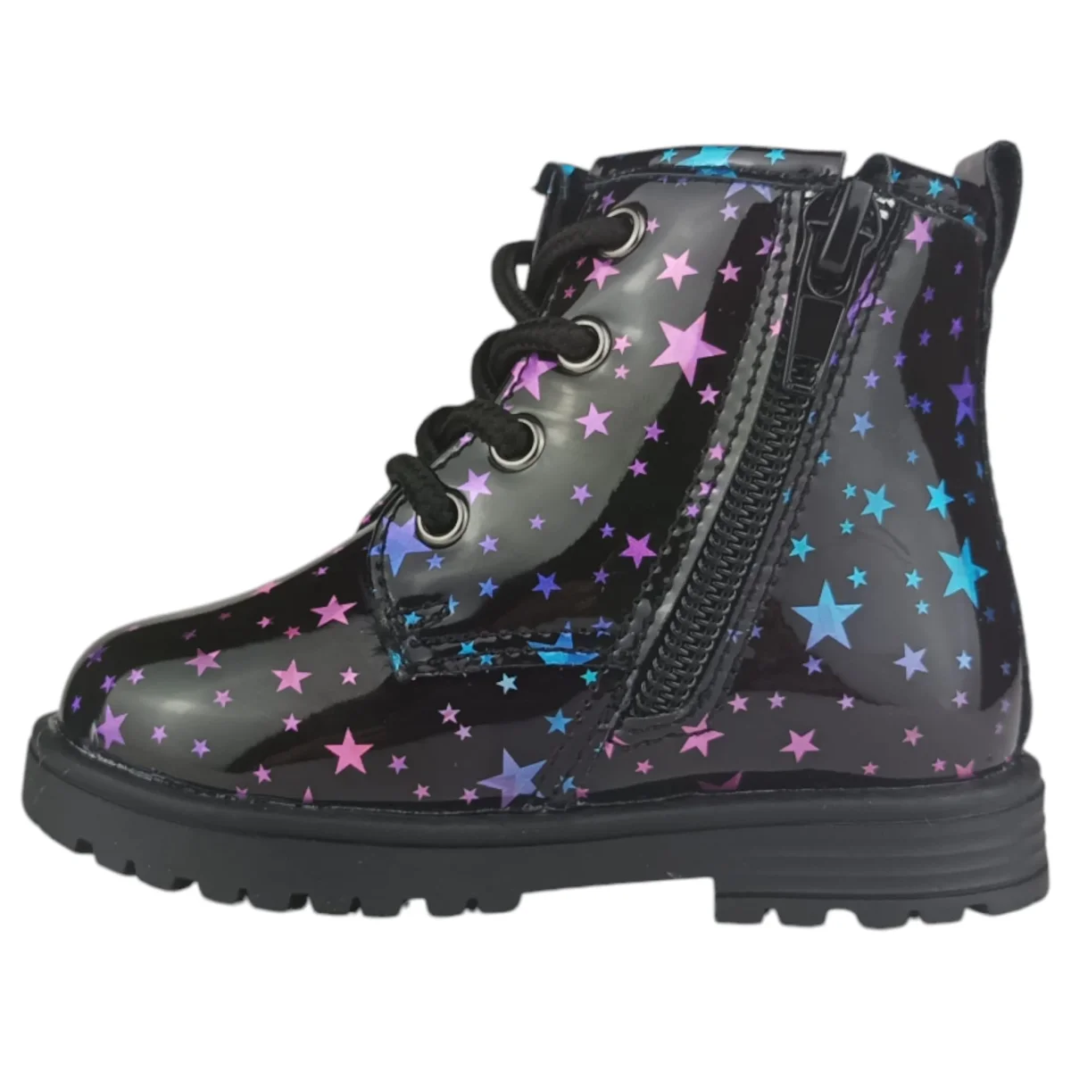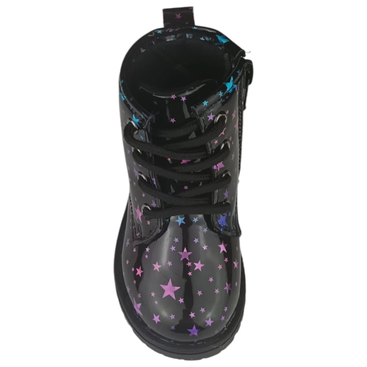 Scarpe MELANIA in vernice a fantasia stelle iridescenti ,chiusura lacci e zip laterale , sottopiede in vera pelle ,fondo leggero in gomma antiscivolo.