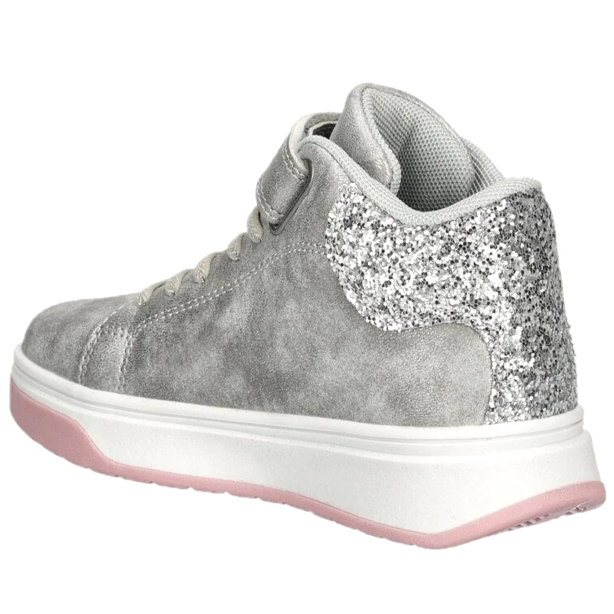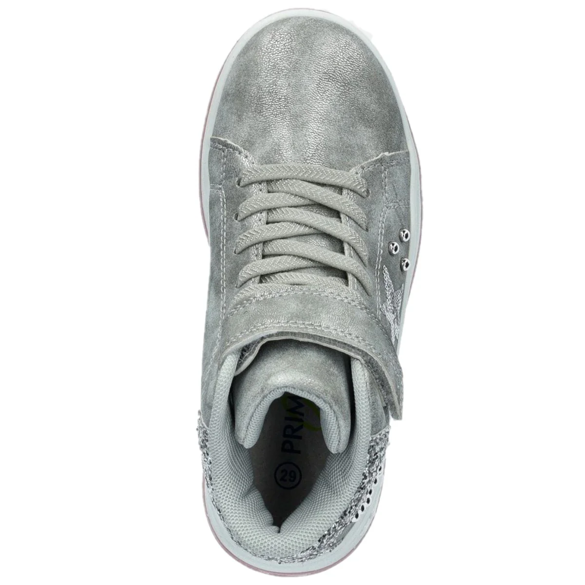 Scarpa PRIMIGI in ecopelle effetto perlato, glitter paillettes e borchiette applicate, chiusura velcro e laccio elastico ,sottopiede in vera pelle ,fondo in gomma antiscivolo.