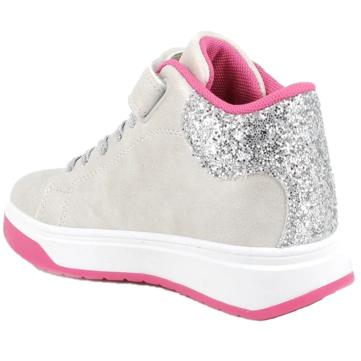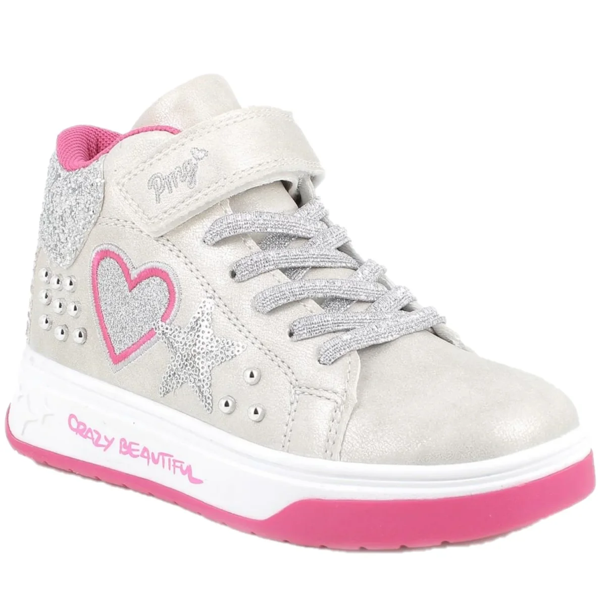 Scarpa PRIMIGI in ecopelle effetto perlato, glitter paillettes e borchiette applicate, chiusura velcro e laccio elastico ,sottopiede in vera pelle ,fondo in gomma antiscivolo.