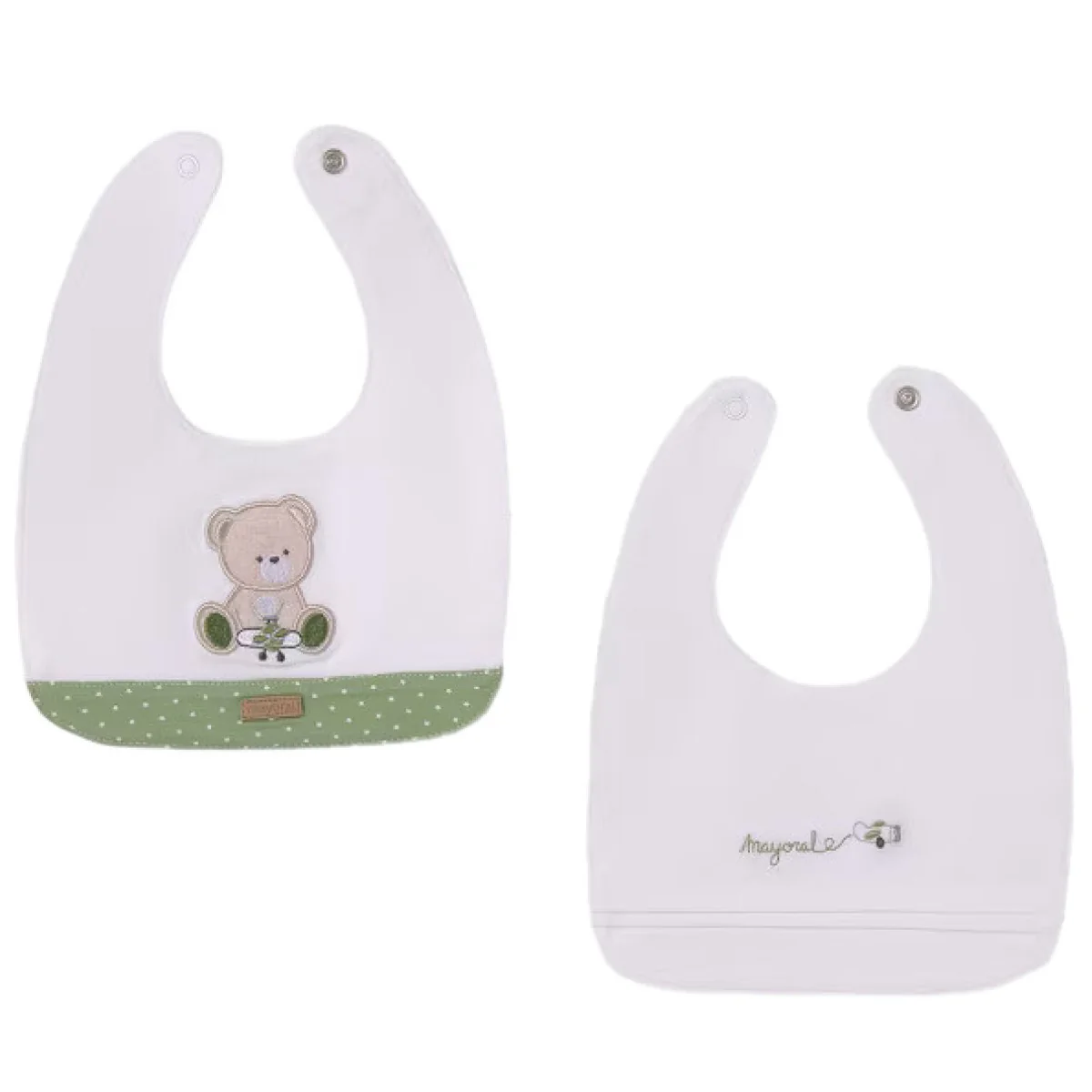 Set 2 bavette MAYORAL in cotone una con patch, ricami e logo applicato, l’ altra con logo ricamato applicato.