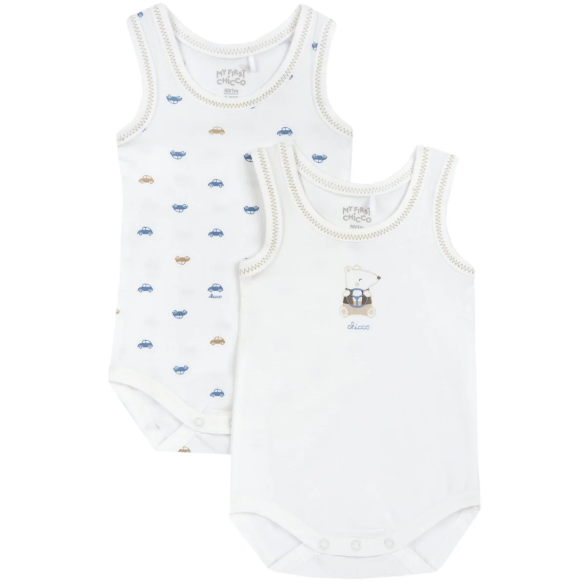 Set due body CHICCO in cotone giromanica, uno a fantasia in colori a contrasto, l’altro con stampa e logo stampato applicato.