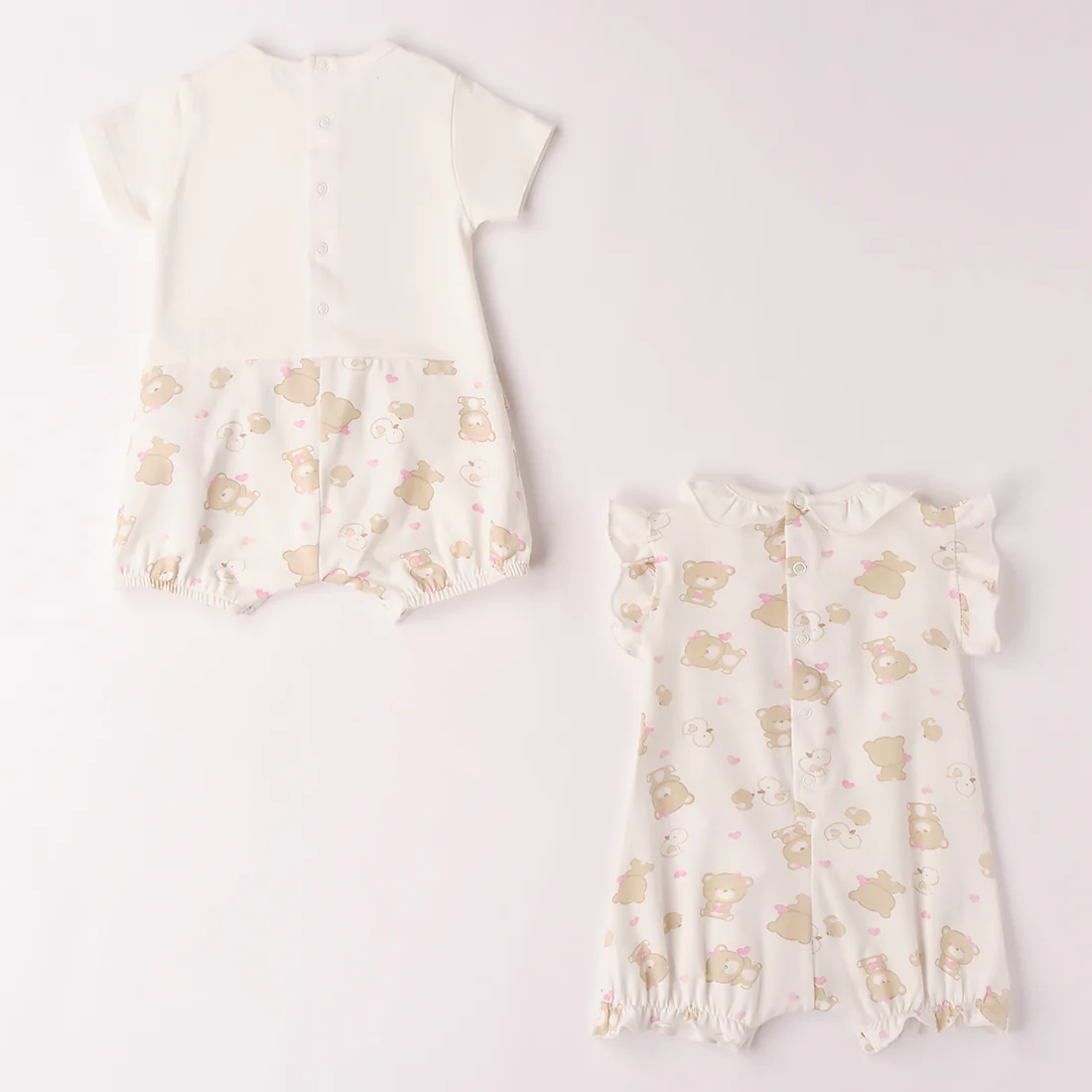 Set 2 Pagliaccetti I DO per neonata in cotone con stampe a contrasto, aperture con clips.
