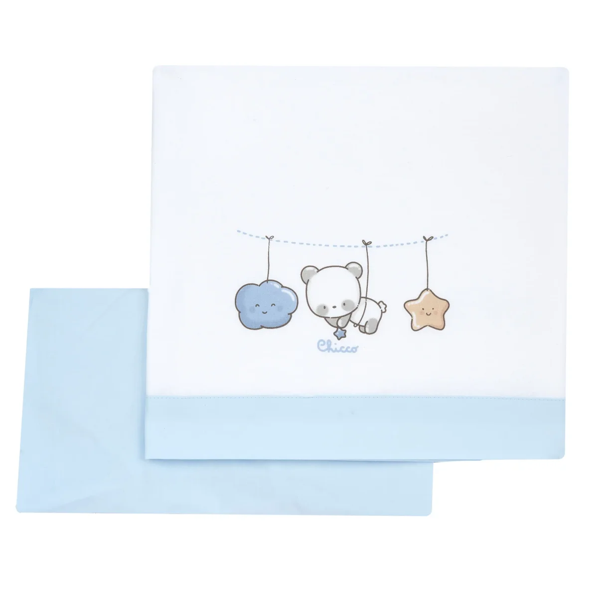 Set lenzuola CHICCO in cotone con stampa, bordo in colore a contrasto, logo stampato applicato, modello per carrozzina.