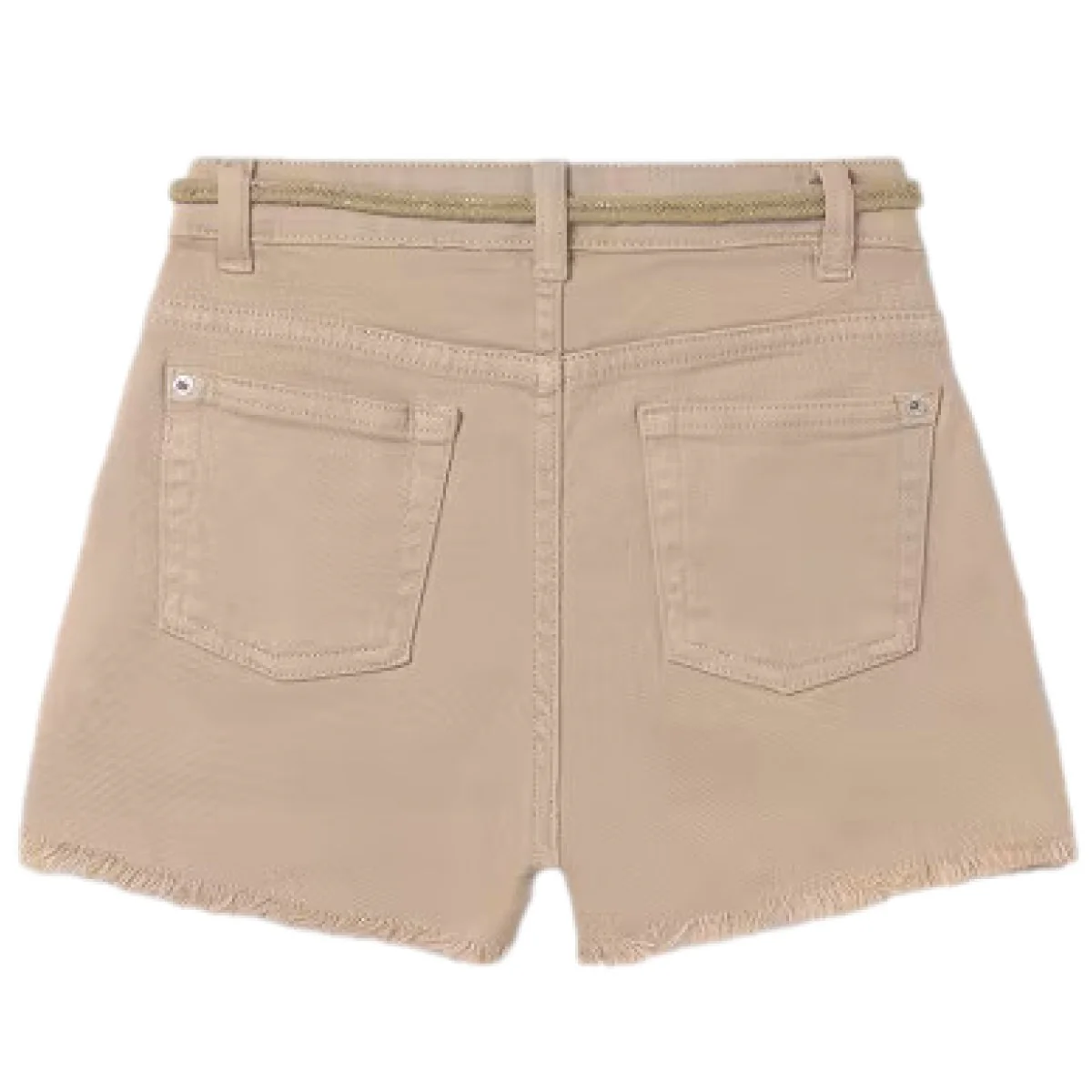 Shorts MAYORAL in jeans con rifinitura sfrangiata ,chiusura bottone e zip ,regoli in vita ,tasche laterali e taschini sul retro,in coordinato cinturina regolabile con inserto laminato.