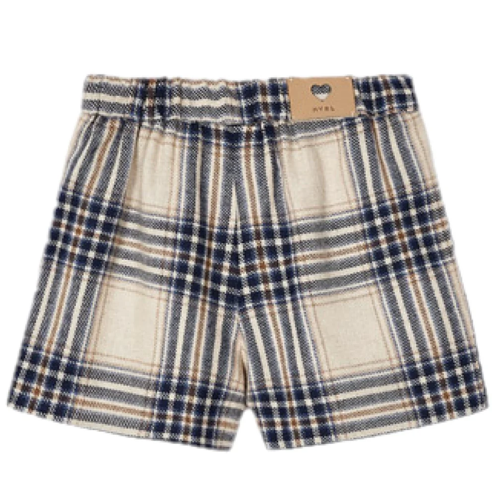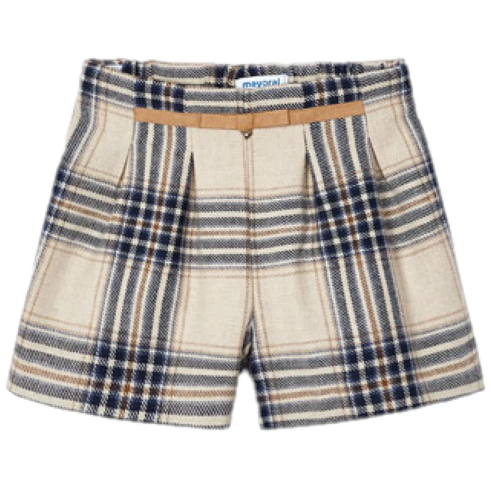 Shorts MAYORAL in misto lana a fantasia scozzese finta cinturina in tessuto scamosciato applicata sul lato anteriore con pendente cuore in metallo elastico sul retro con logo a rilievo.