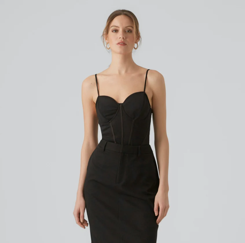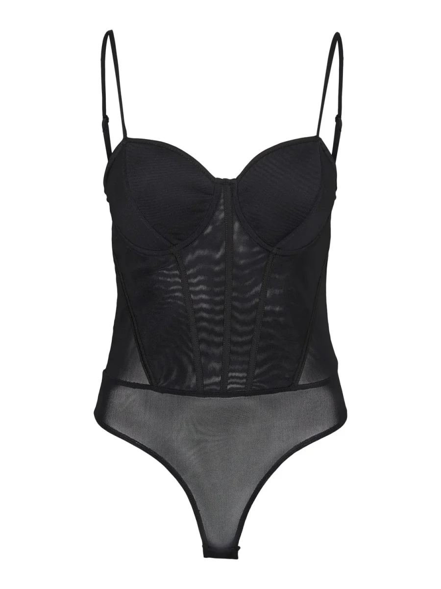 Body con corpetto modello bustier in tessuto garzato non elasticizzato. Coppe imbottite, bretelle sottili regolabili. Corpetto con stecche. Parte inferiore chiusa da bottoncini automatici. Vestibilit� molto aderente. Taglia in foto S. Composizione tessuto 95% poliestere 5% elastan.
