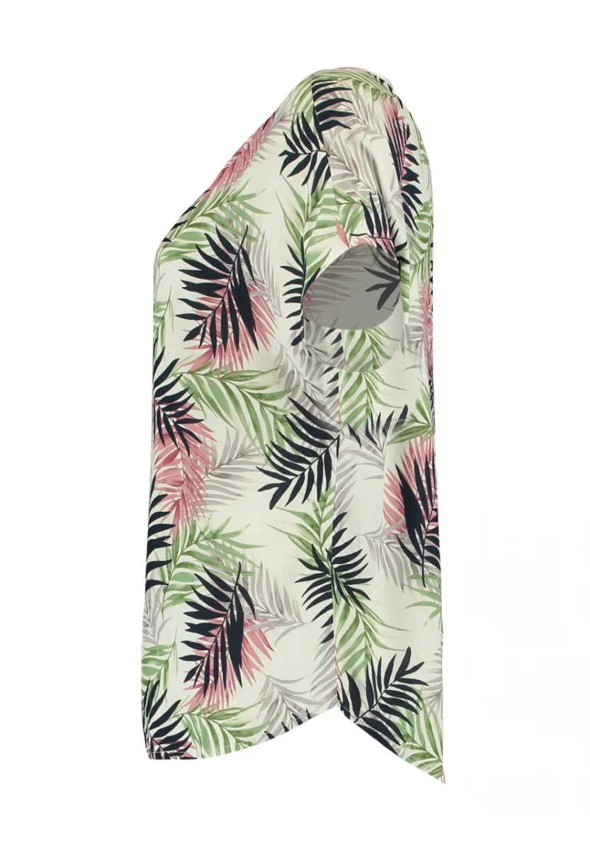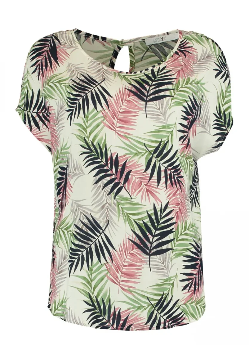 T-shirt basica in tessuto 100% viscosa stampa palme multicolor. Girocollo ampio, chiusura con bottoncino al collo e goccia sulla schiena. Maniche corte. Vestibilità comoda.