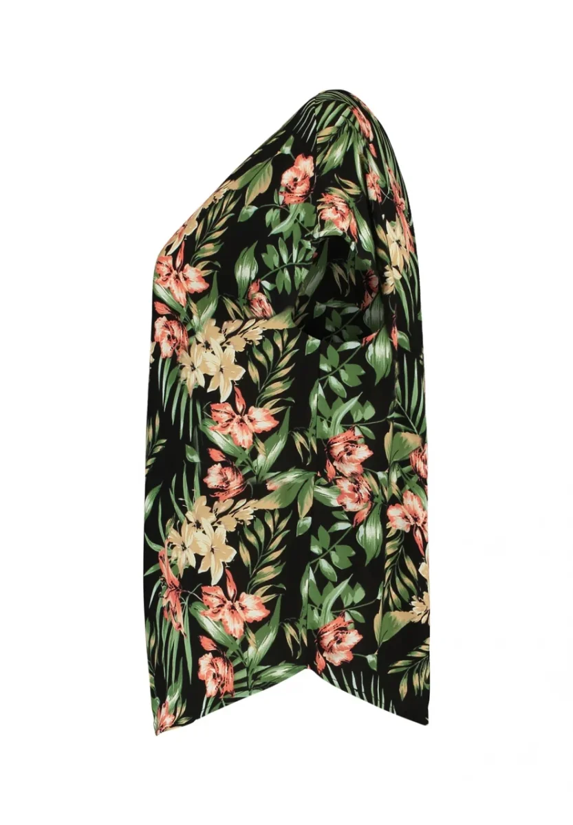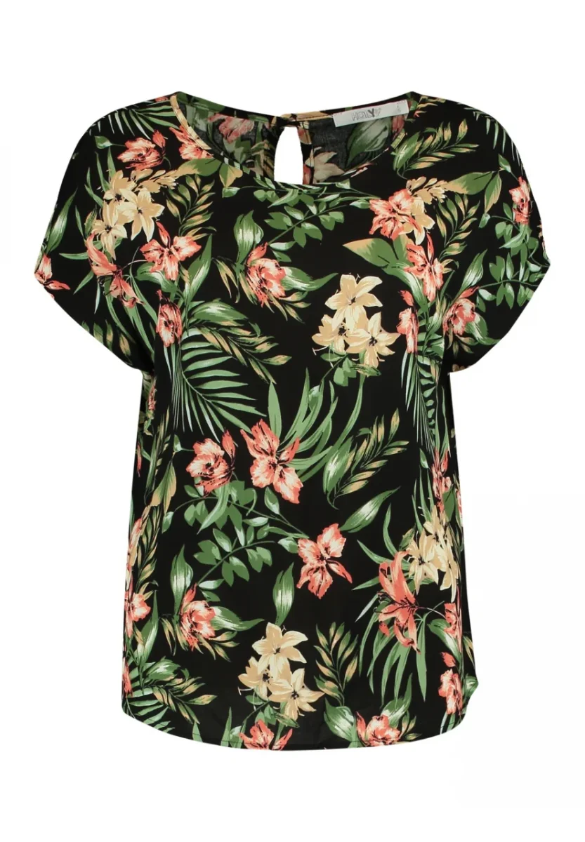 T-shirt basica in tessuto 100% viscosa stampa floreale. Girocollo ampio, chiusura con bottoncino al collo e goccia sulla schiena. Maniche corte. Vestibilità comoda.
