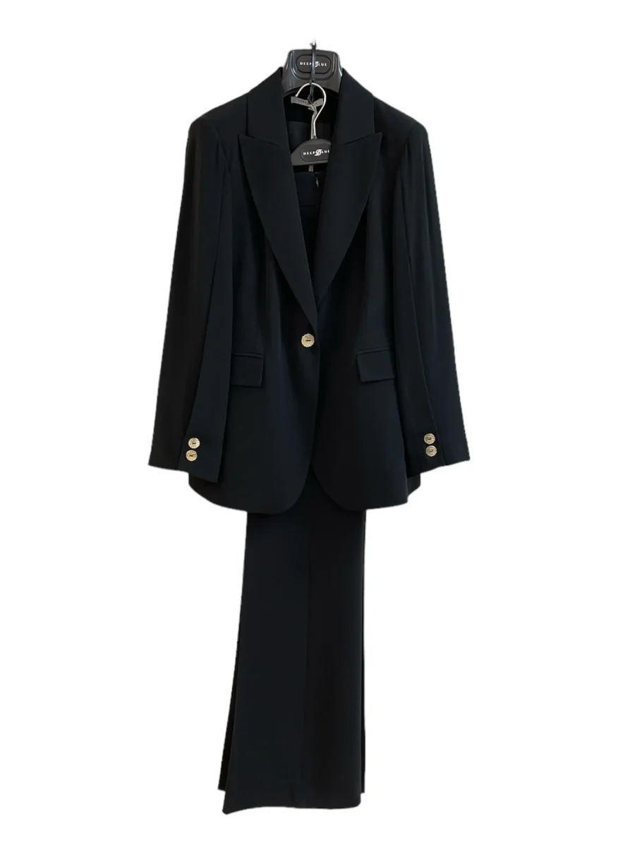Tailleur in tessuto leggero fluido. Collo con revers ampi a lancia, impunture su tutta la lunghezza. Maniche lunghe con polsino camicia chiuso da bottoni dorati ed aperture. Chiusura centrale ad un bottone, tasche laterali con pattina applicata. Pantalone vita alta, chiusura con zip e bottone. Gamba stretta e fondo a zampa. Vestibilità slim regolare. Composizione tessuto 95% poliestere 5% elastan.