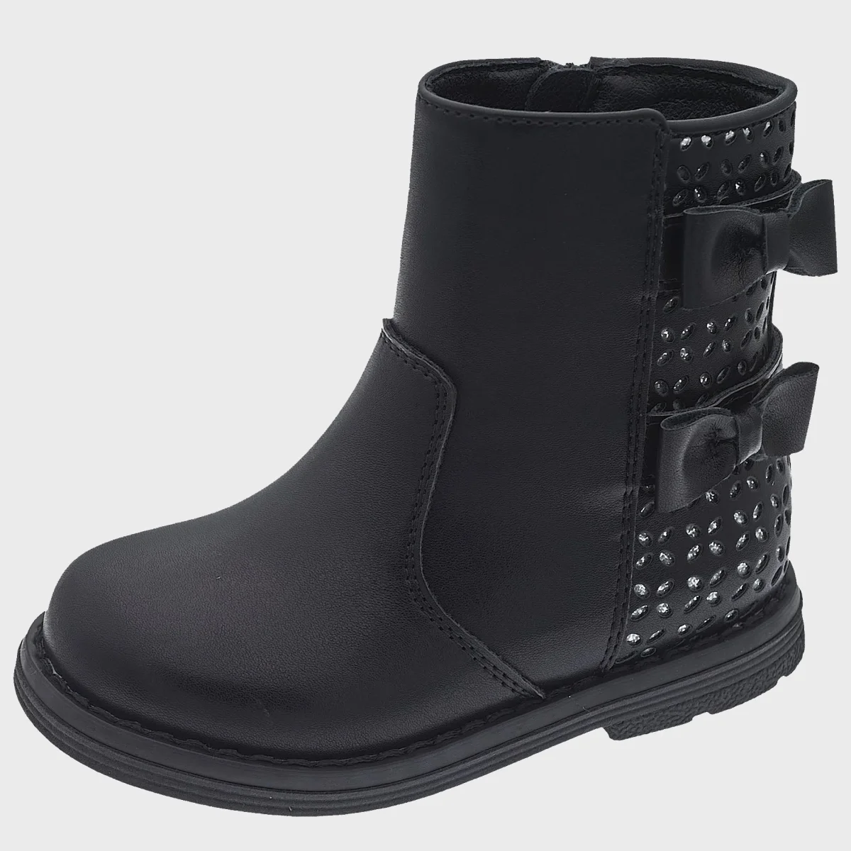 Stivaletti CHICCO in ecopelle con fantasia micro traforata con glitter applicati, chiusura con zip laterale, fiocchi applicati, fondo in gomma leggero e flessibile.