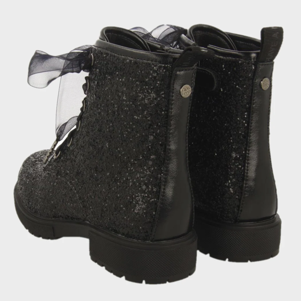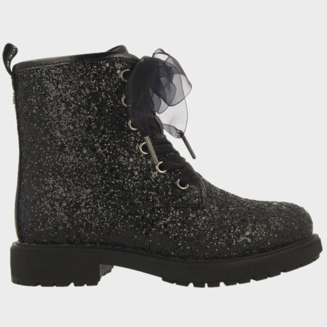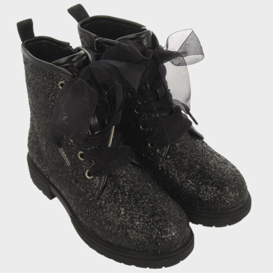 Stivaletti GIOSEPPO modello anfibio, glitterati con lacci in tulle e zip laterale per facilitare la calzata. fondo in gomma antiscivolo.