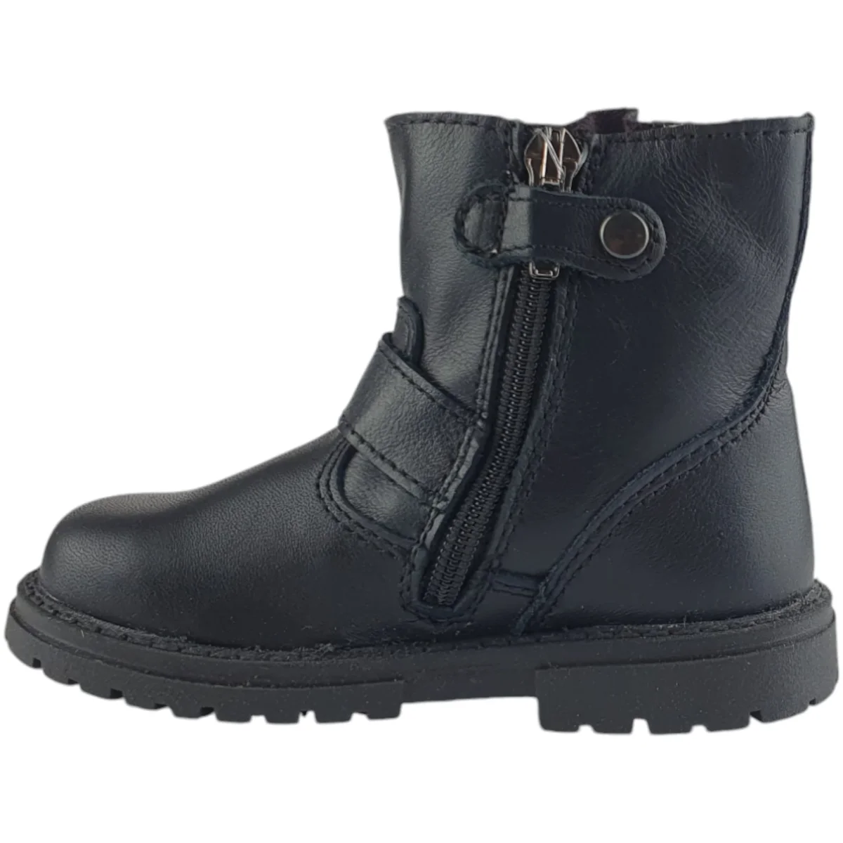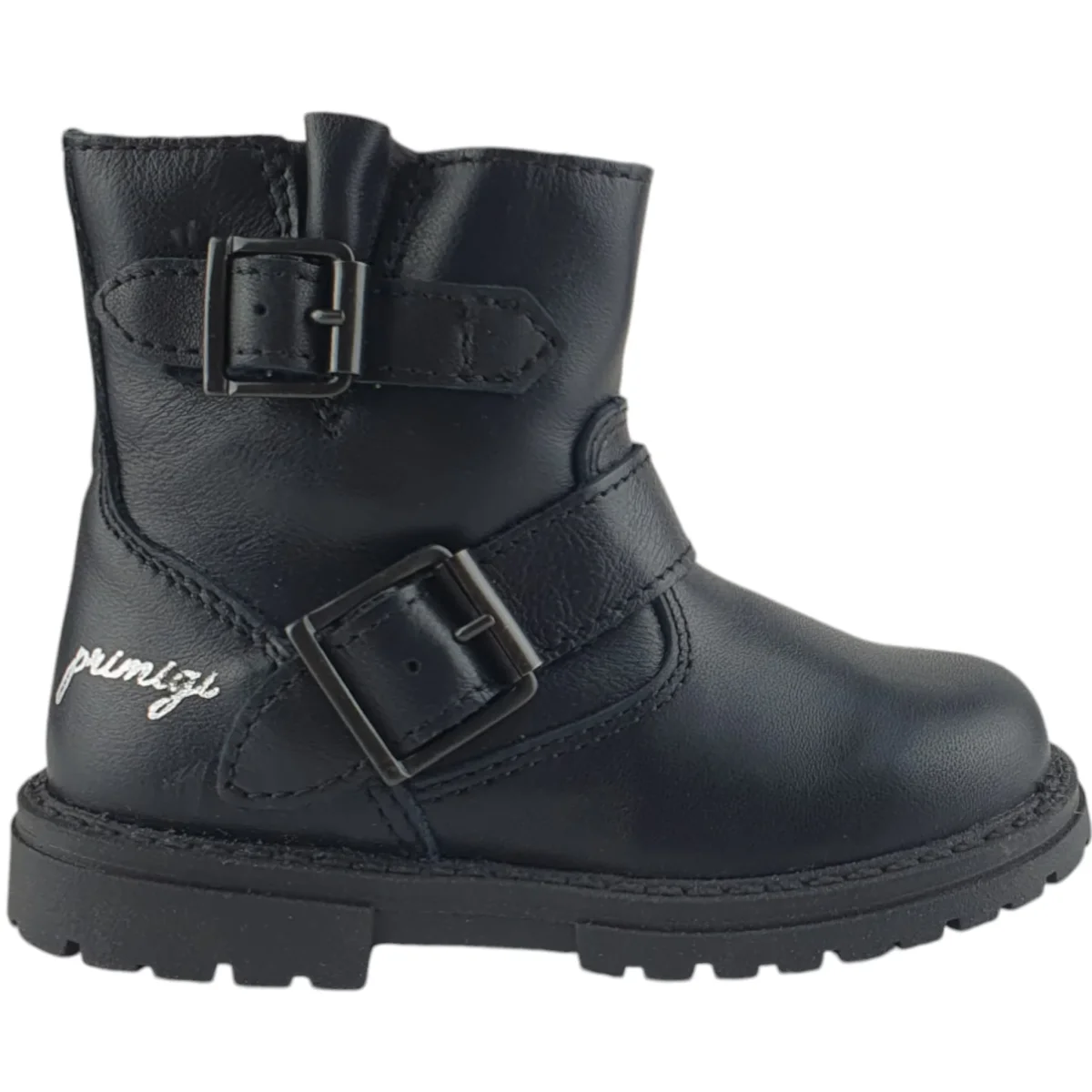 Stivaletto PRIMIGI in pelle , chiusura con zip , fondo in gomma antiscivolo , logo stampato e finte fibbie.