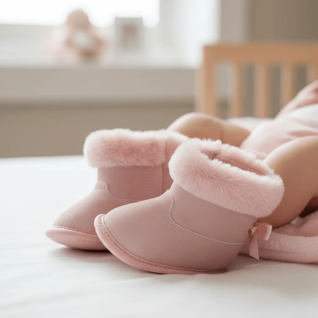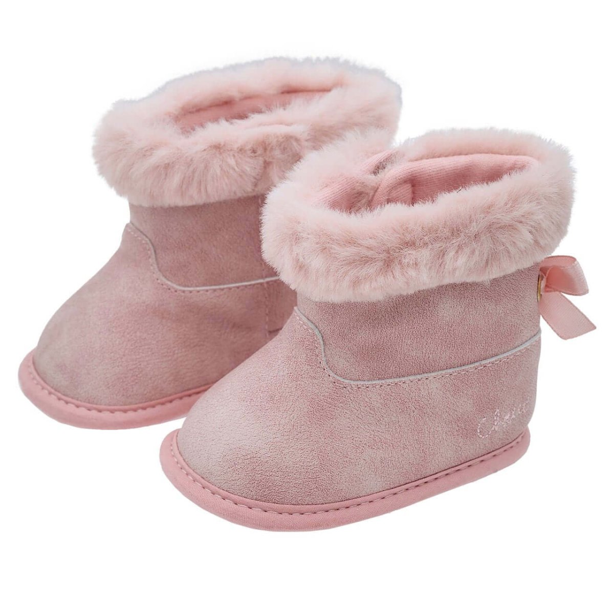 Stivaletto CHICCO da culla rosa , con fiocco in raso e bordo in tessuto effetto pelliccia , chiusura con strappo.