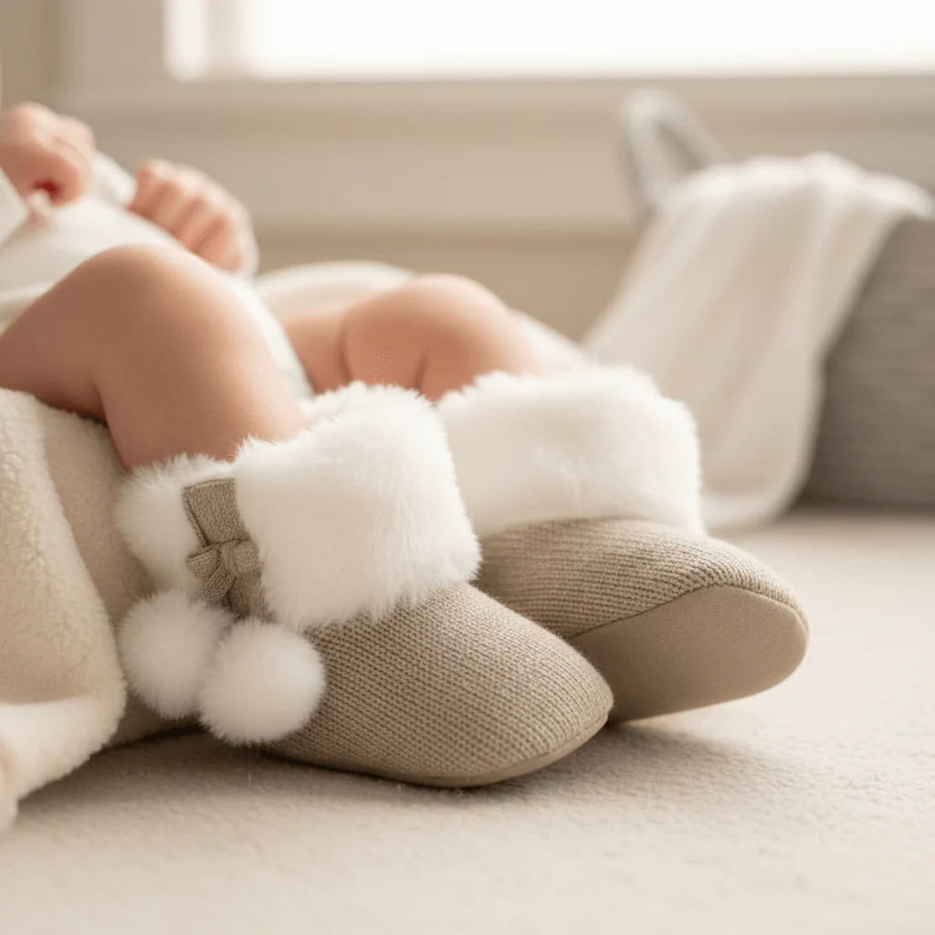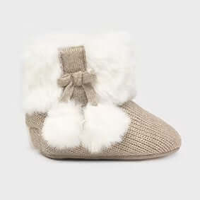 Stivaletto MAYORAL neonata , modello da culla con bodo e pompon in ecopelliccia.