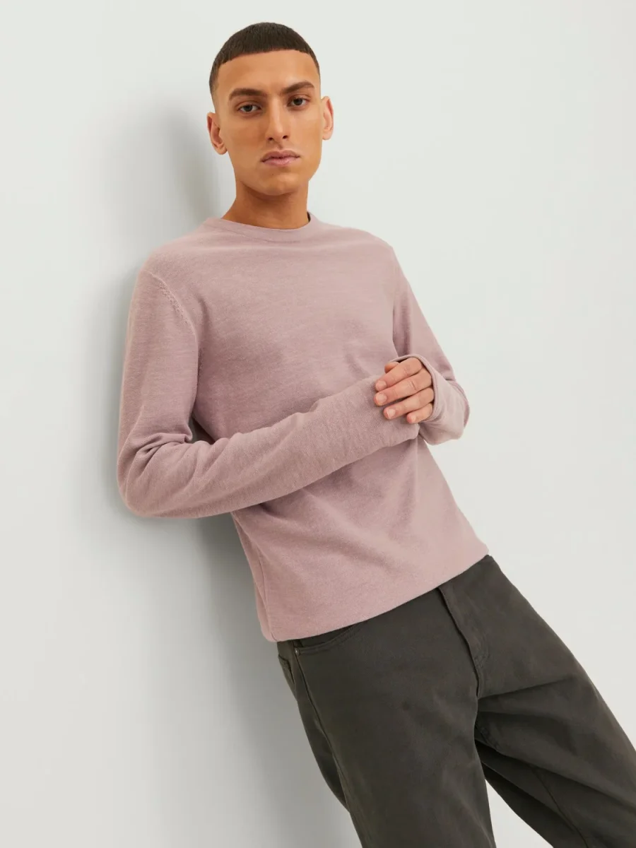 Maglia basica in tessuto misto cotone/lino. Girocollo regolare con bordo lavorato, maniche lunghe. Vestibilità slim. Taglia in foto L. Composizione tessuto 90% cotone 10% lino.