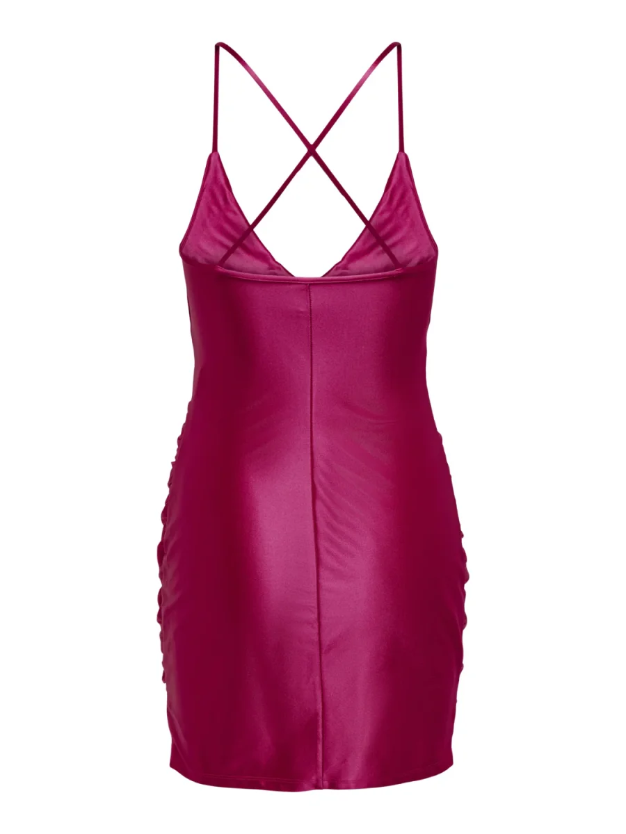 Vestito corto in tessuto elasticizzato rasato lucido. Scollo ampio a punta, bustino aderente, bretelle sottili regolabili. Cucitura centrale arricciata, drappeggio laterale. Schiena scoperta: Vestibilità aderente. Taglia in foto S. Composizione tessuto 95% poliestere 55 elastan.