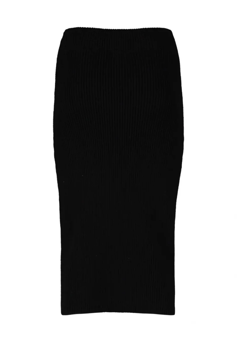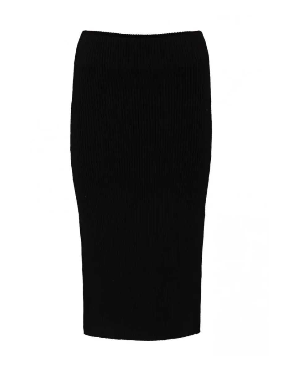 Gonna longuette in tessuto misto viscosa elasticizzato. Vita regolare con elastico, tessuto lavorato a costine. Vestibilità aderente. Composizione tessuto 50% viscosa, 27% nylon, 23% poliestere.