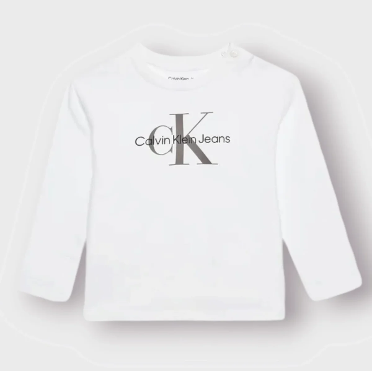 T-shirt CALVIN KLEIN in cotone , modello manica lunga girocollo con stampa a contrasto ,chiusura clips su spalla fino alla taglia 24mesi.