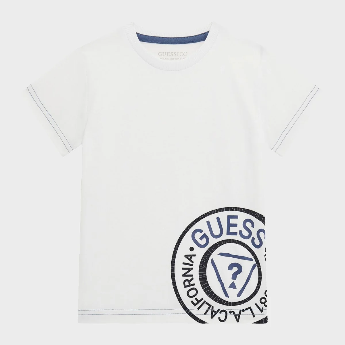 T-shirt GUESS in cotone con stampa . Dalla 3/6 mesi alla 24 mesi ci sono clips al colletto per facilitare nell’indossare il capo.