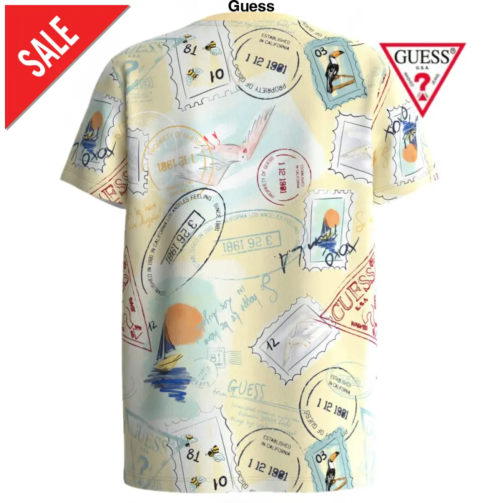 T-shirt GUESS in cotone modello girocollo mezza manica con stampa e logo ricamato a rilievo chiusura clips su spalla fino alla taglia 24mesi.