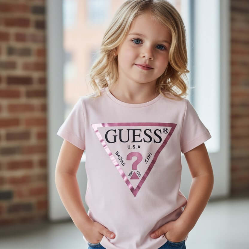 T-shirt GUESS in cotone iconica rosa con logo laminato.