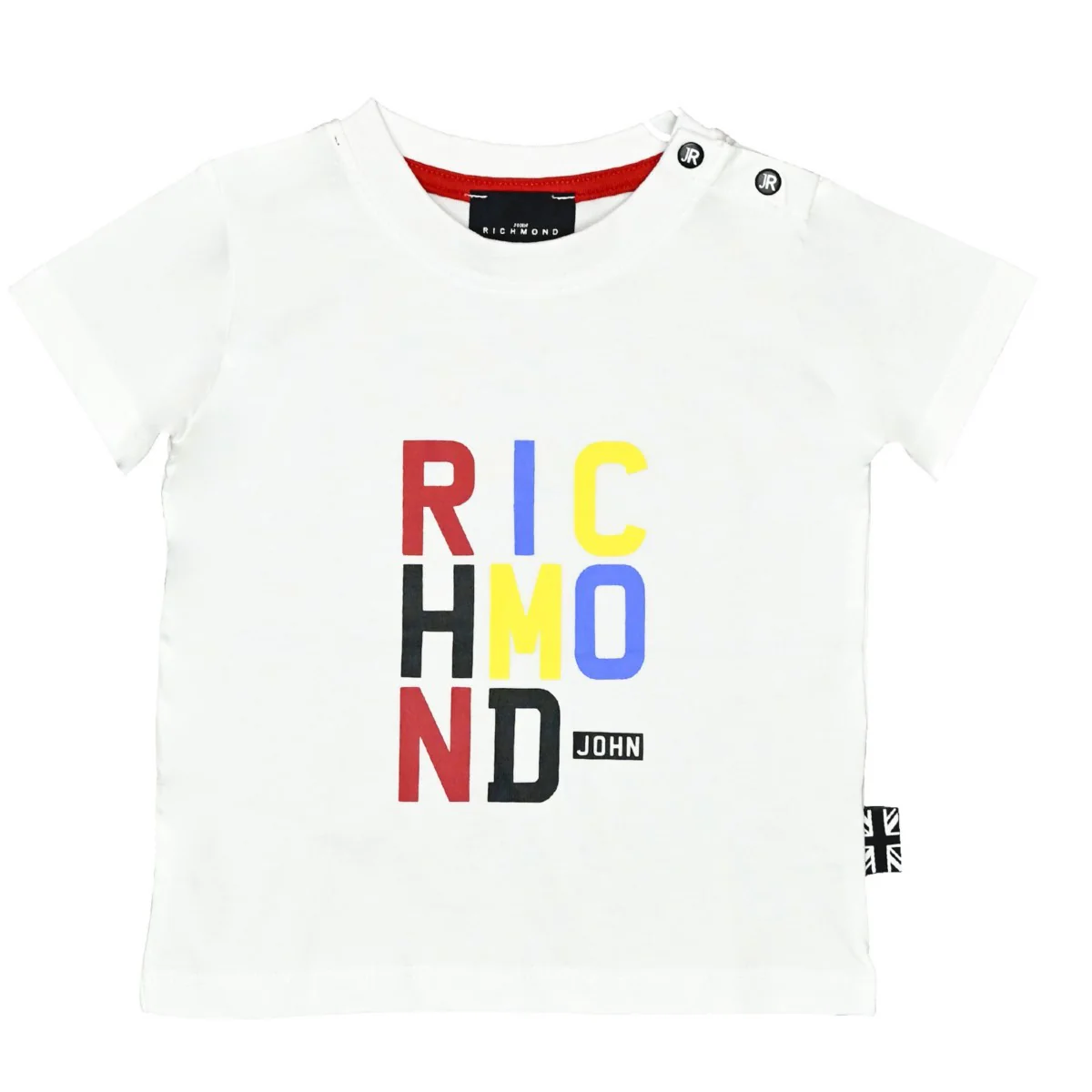 T-shirt JOHN RICHMOND in cotone con logo stampato in colori a contrasto, chiusura con clips logate su spalla.