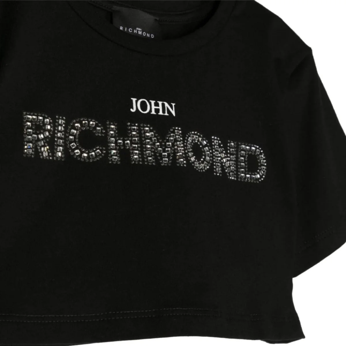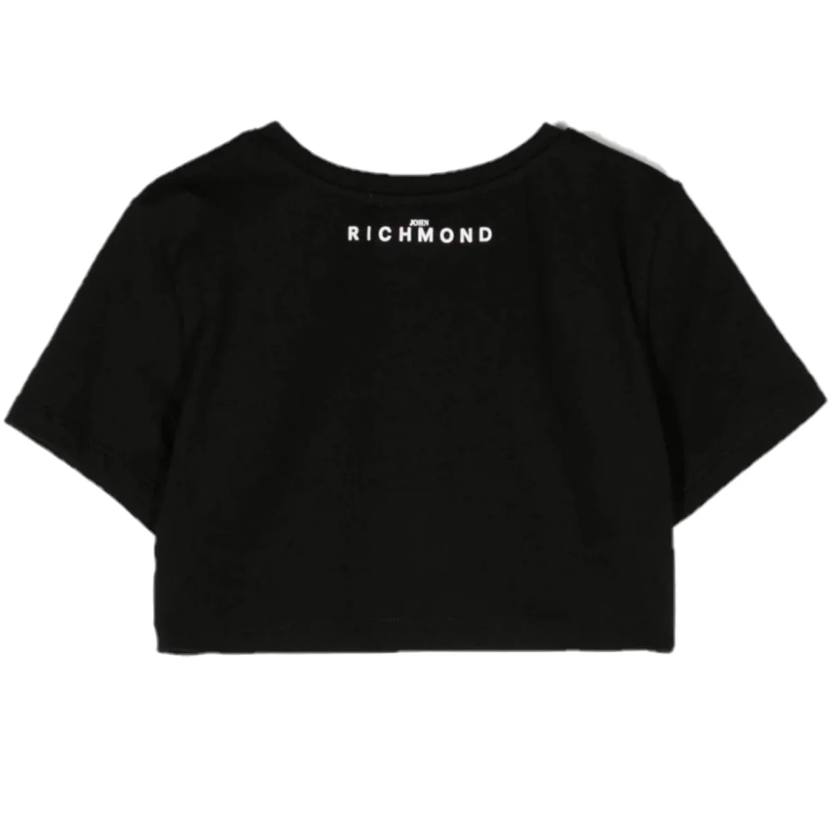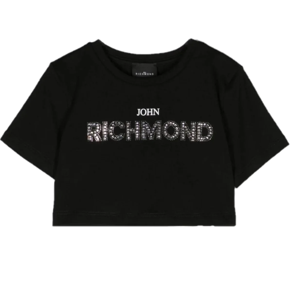 T-shirt JOHN RICHMOND in cotone modello Cropped (corto) ,girocollo a mezza manica con logo in strass applicati.