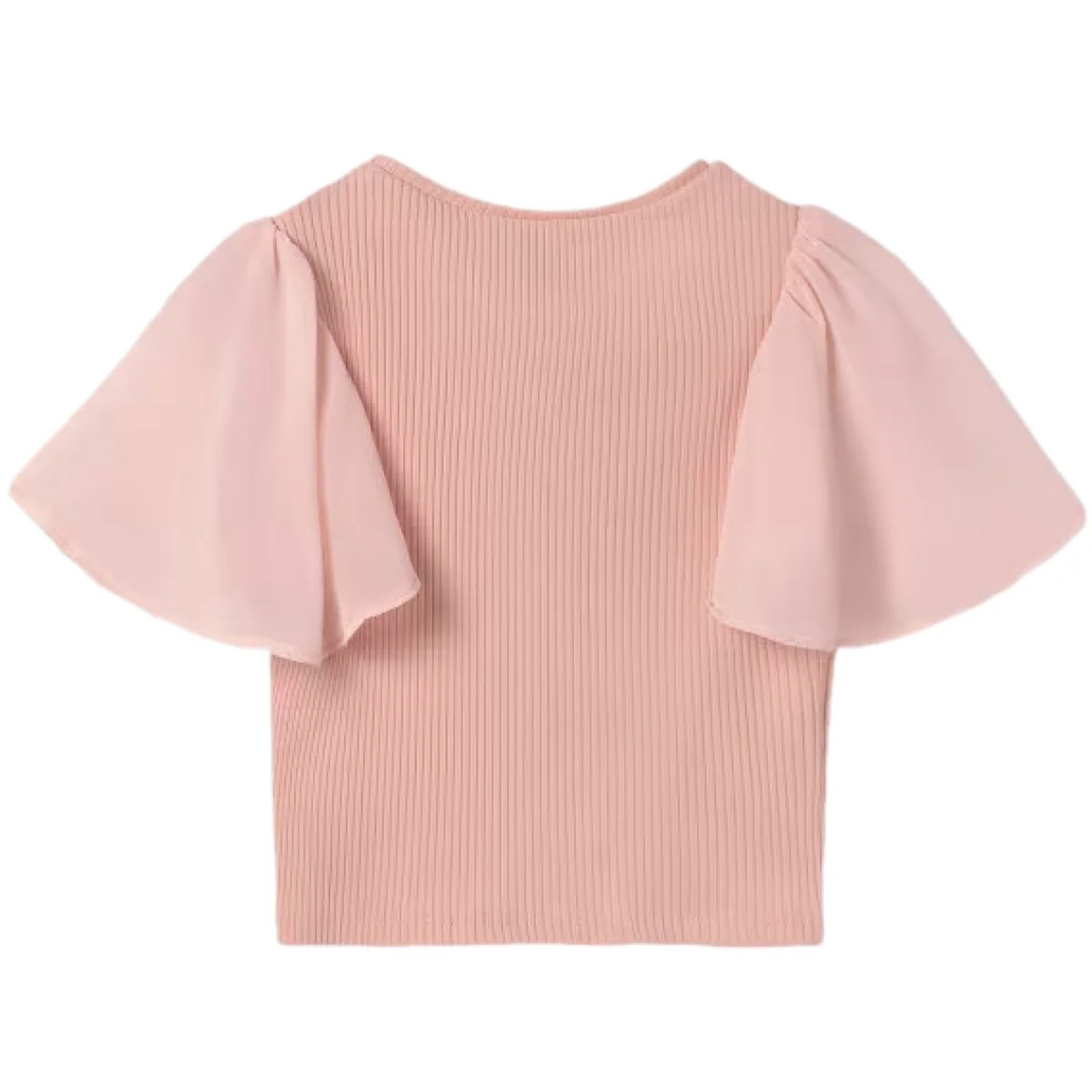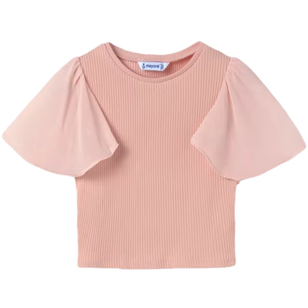 T-shirt MAYORAL in cotone a costine, modello girocollo mezza manica con velo applicato.
